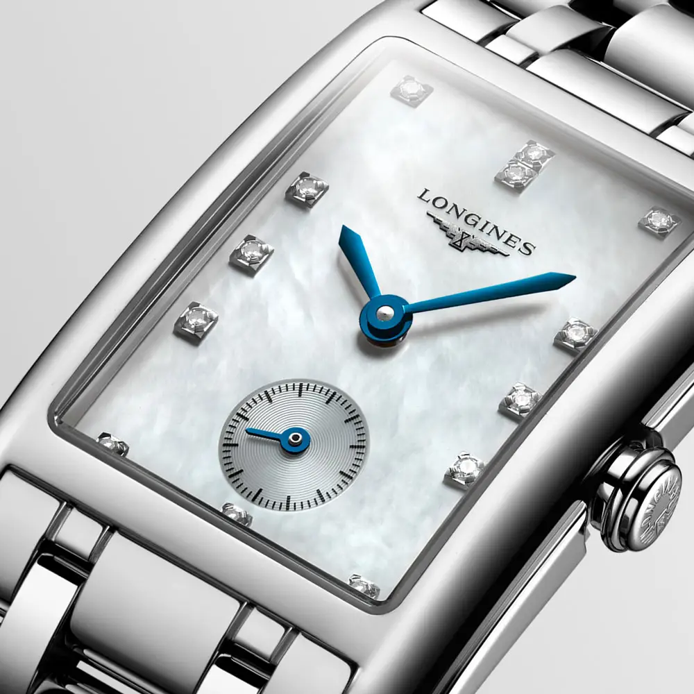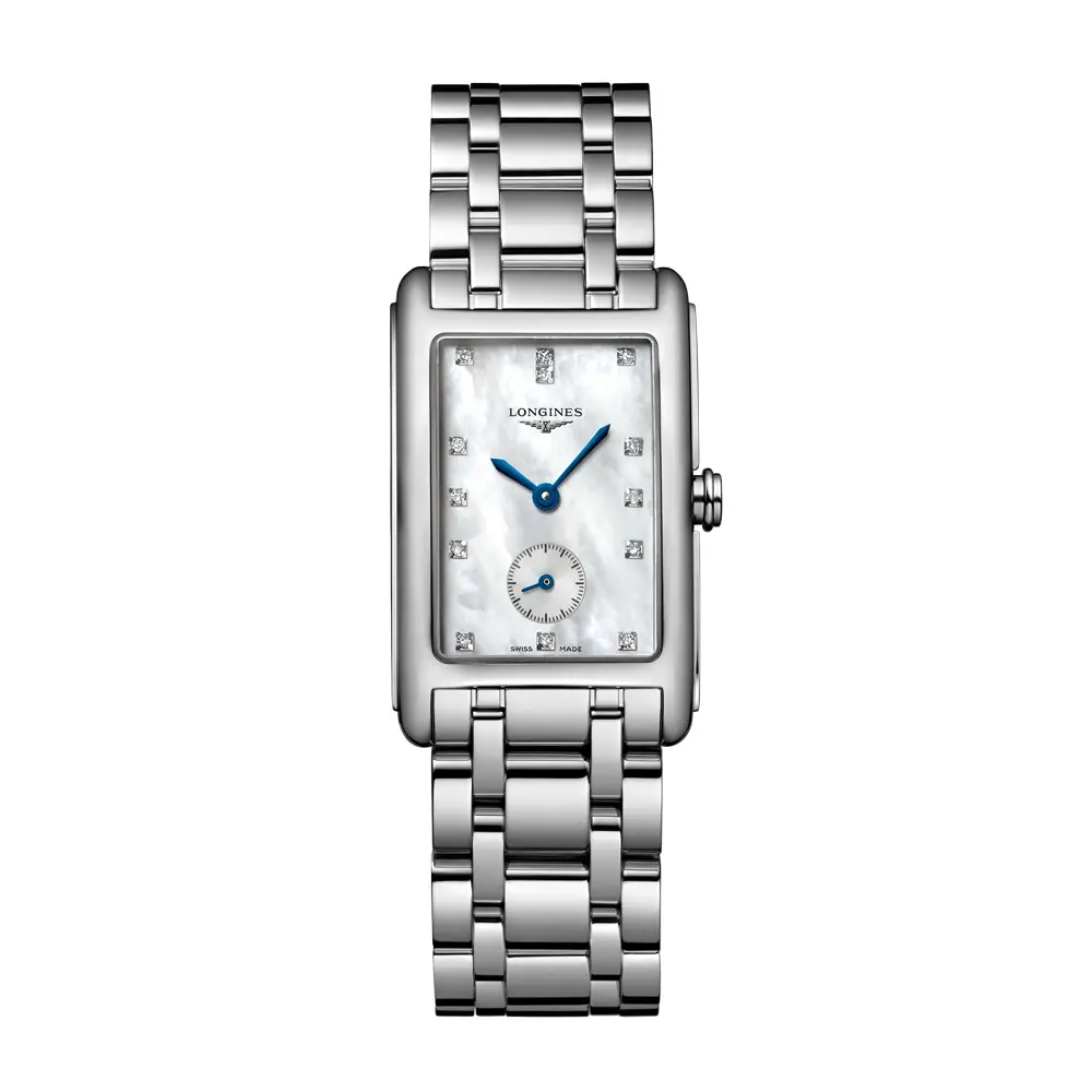 The Longines DolceVita L5.512.4.87.6 is an elegant ladies’ watch that combines the classic shapes of the DolceVita collection with a refined modern touch. Its 23.30 × 37.00 mm stainless steel case frames a dial with subtle details, emphasizing its sophisticated character.