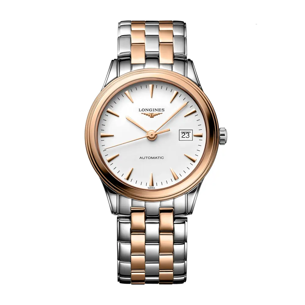 The Longines Flagship Classic L4.974.3.92.7 embodies timeless elegance and the finest Swiss watchmaking tradition. Its 38.5 mm stainless steel case with rose gold PVD coating enhances the refined appearance, while the white dial with date window ensures clarity and harmony.