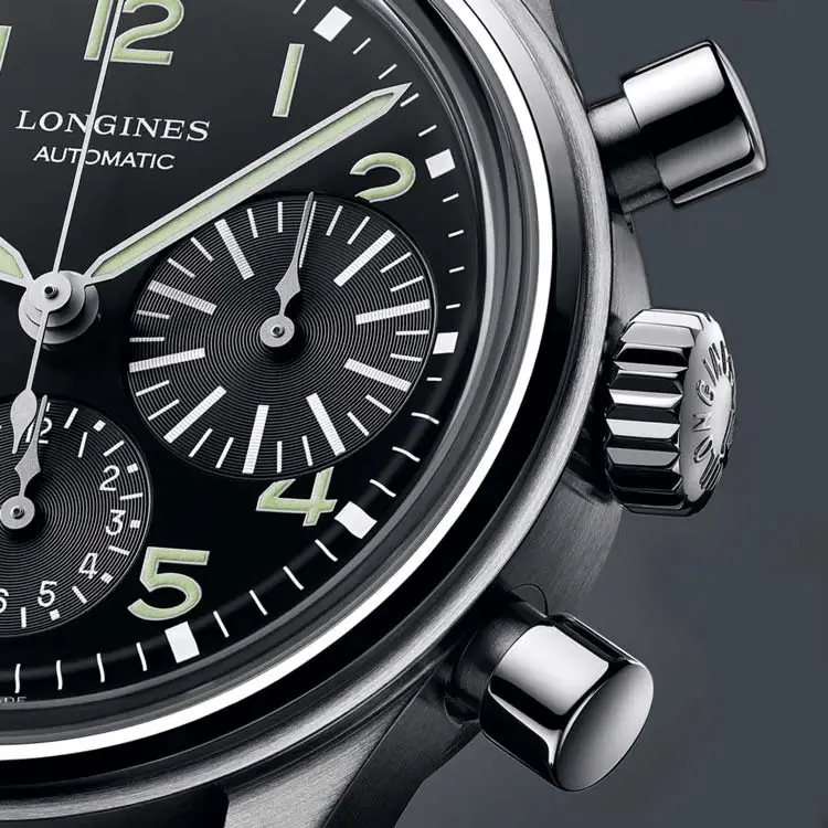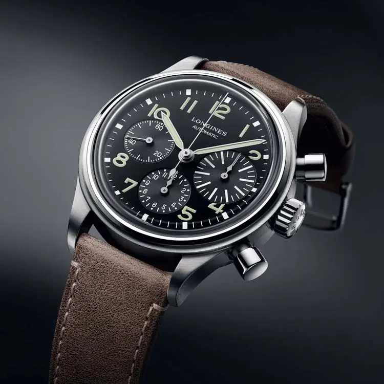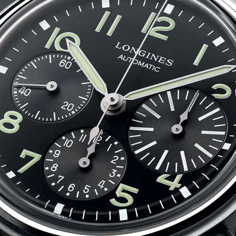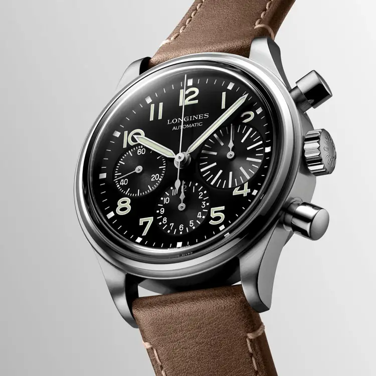 The 41 mm polished stainless-steel case houses a matte black dial with large Arabic numerals and hands coated in Super-LumiNova® for perfect readability in any light. Its distinctive oversized 30-minute counter at 3 o’clock — the signature BigEye feature — enhances the watch’s unique character. The model is powered by the automatic Longines L688 movement with a 66-hour power reserve, protected by a sapphire crystal with anti-reflective coating.