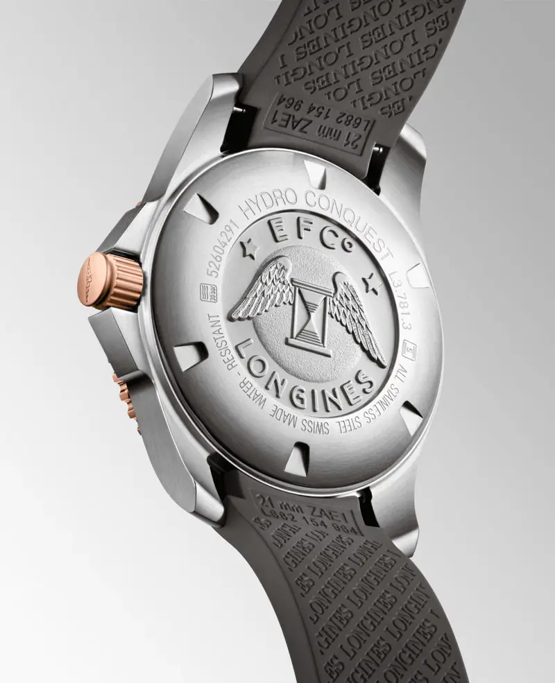 Inside beats the automatic calibre L888 with a 72-hour power reserve and 25,200 vph, confirming Swiss watchmaking reliability. The model is fitted with a grey rubber strap with double safety folding clasp, offering comfort and security. The HydroConquest L3.781.3.78.9 embodies performance, durability, and Swiss watchmaking tradition.