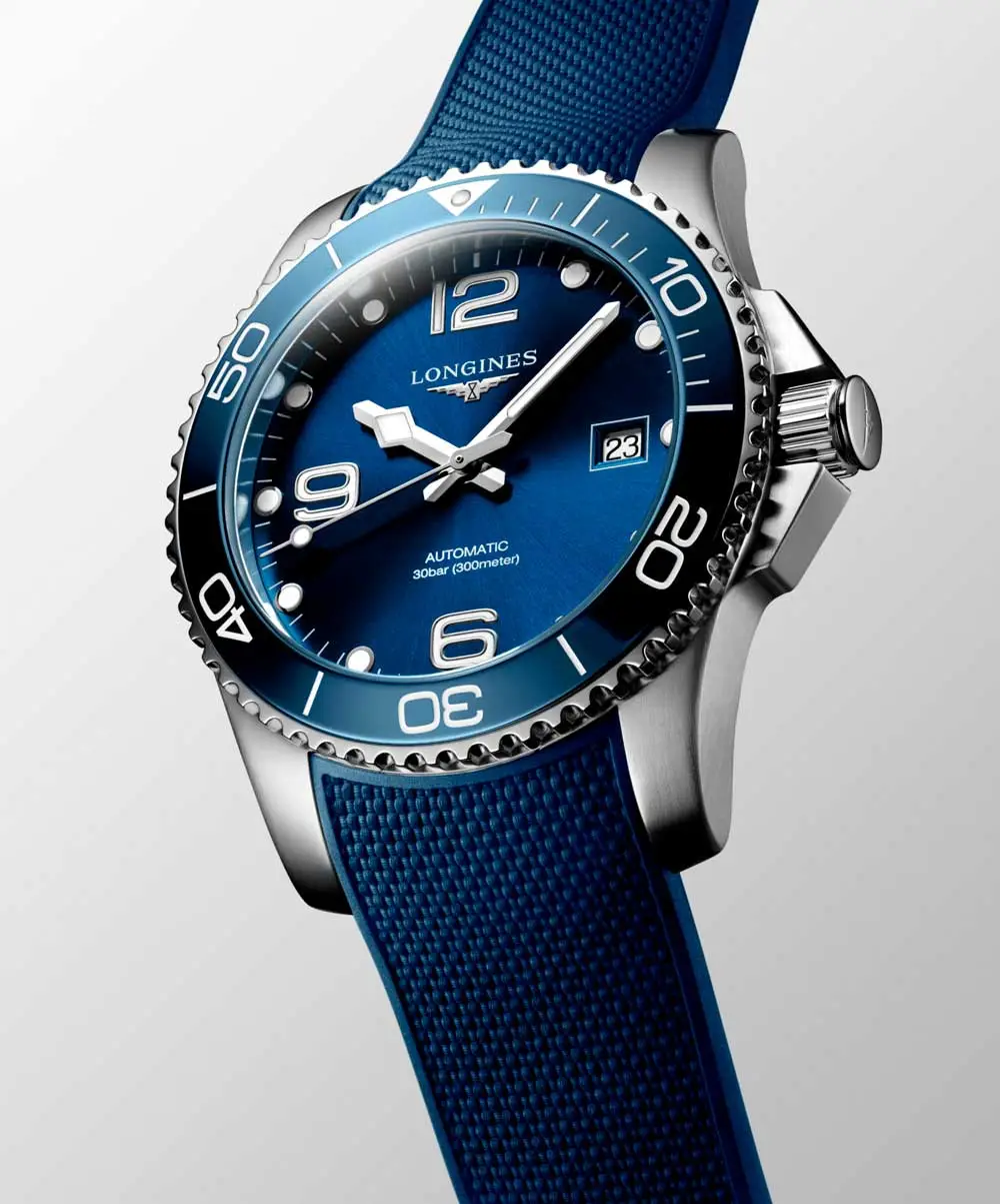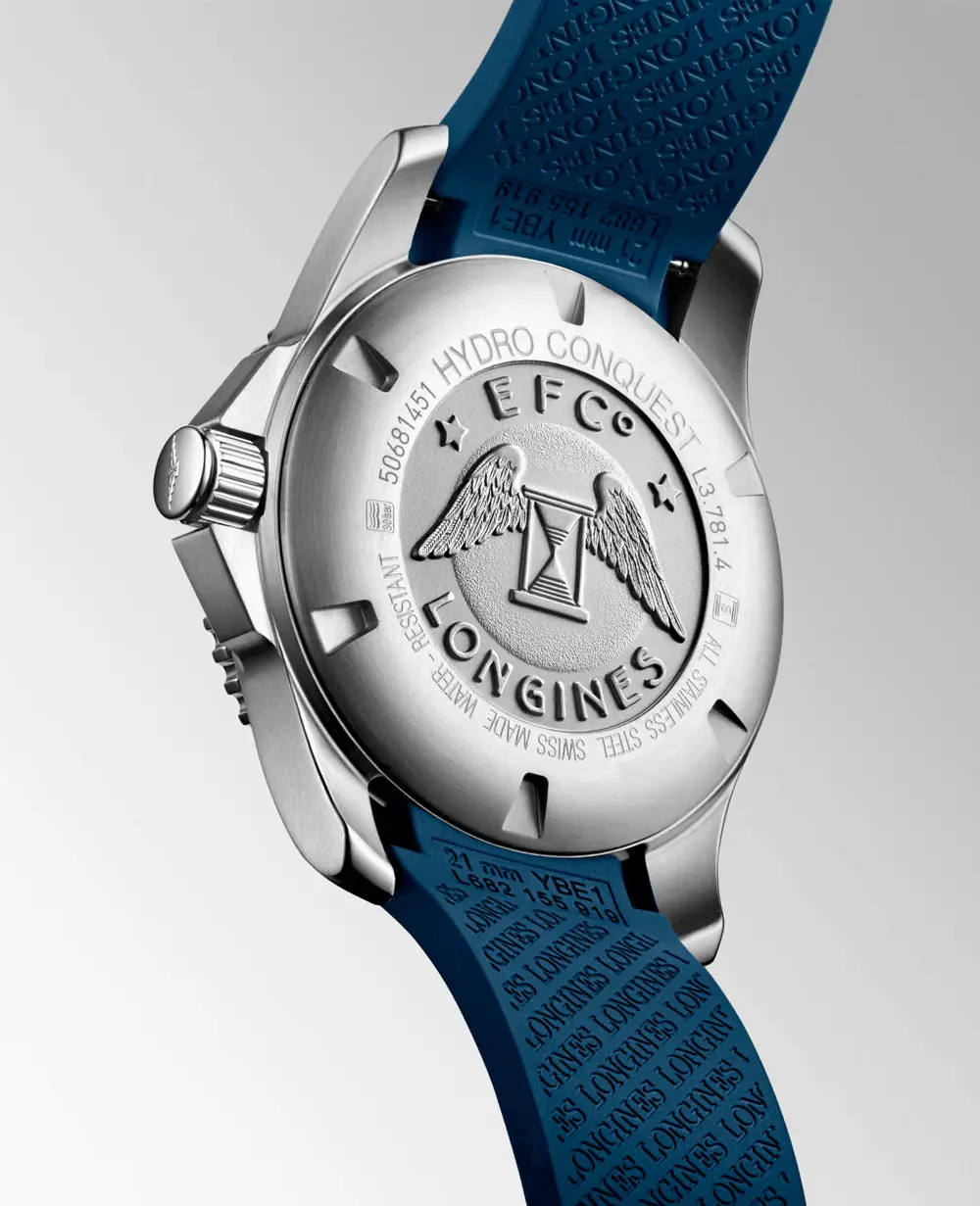 The blue rubber strap with folding clasp and double security system offers comfort and reliability on the wrist. The HydroConquest L3.781.4.96.9 appeals to anyone seeking the ideal blend of durability, sporty spirit, and Swiss refinement.