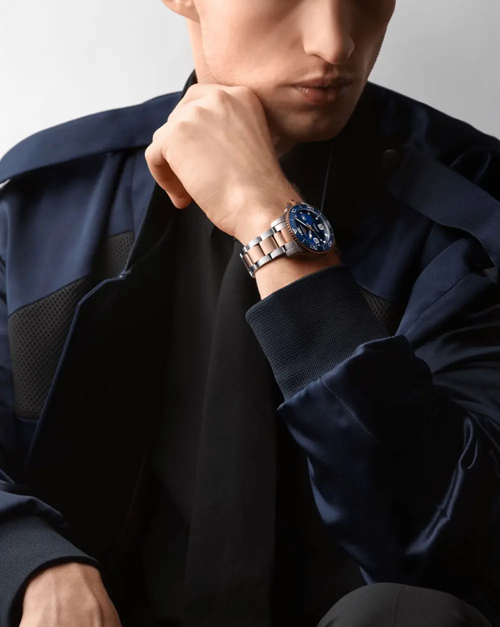 The blue sunray dial with applied indexes and Arabic numerals is complemented by Super-LumiNova® luminous hands, ensuring excellent readability even in the dark. A date window at 3 o’clock adds practicality while preserving the design balance.