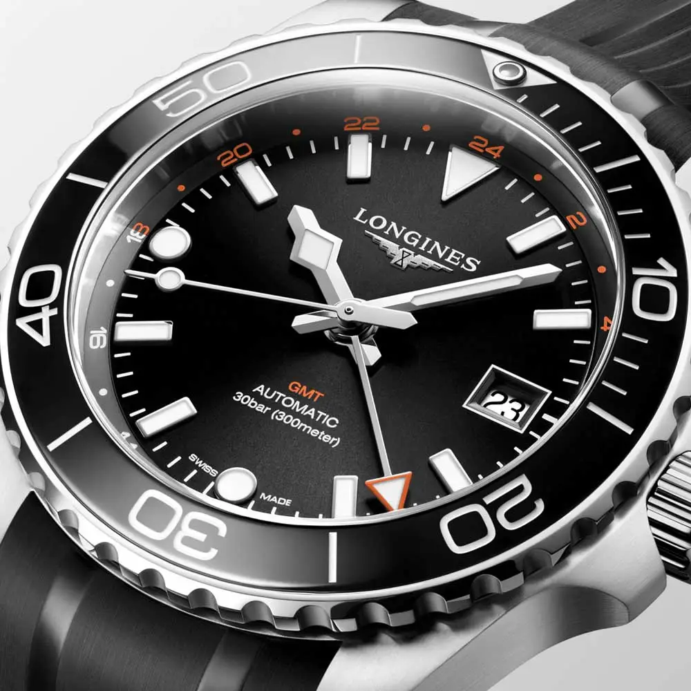 The Longines HydroConquest GMT L3.790.4.56.9 combines dual-time functionality with robust sporting style. Its 41 mm stainless steel case is fitted with a ceramic bezel and sapphire crystal with anti-reflective coating. With 30 bar (300 m) water resistance, screw-down crown, and unidirectional bezel, it is built for performance.