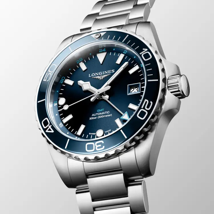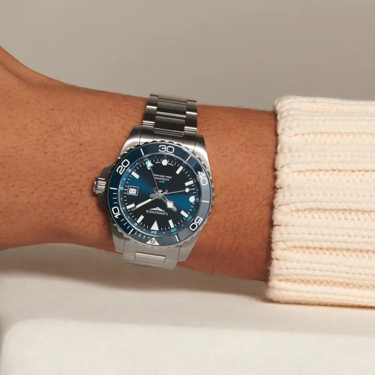 The watch is fitted with a stainless steel bracelet featuring a folding clasp with double security and micro-adjustment, ensuring perfect comfort. The HydroConquest GMT L3.790.4.96.6 is the ideal choice for global travelers seeking the fusion of Swiss precision, technical innovation, and underwater reliability.