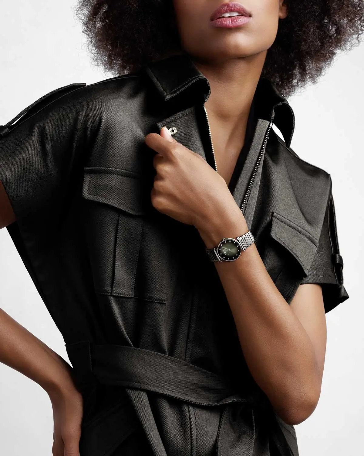The dial in a deep green shade is adorned with 12 diamond indexes (0.081 ct), creating a harmonious contrast and adding a luxurious brilliance. Polished minimalist hands underline the timeless character, making this timepiece ideal for both special occasions and daily elegance.