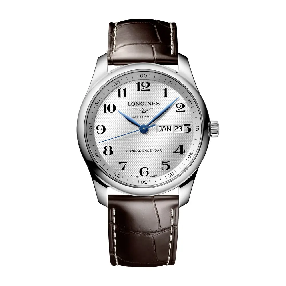 The Longines Master Collection L2.910.4.78.3 embodies the sophisticated elegance that is characteristic of this prestigious Longines line. The 40 mm round case made of stainless steel is paired with a classic silver dial featuring a fine grain pattern and blue hands, giving the watch a distinctive character. Its timeless appearance is complemented by a brown genuine alligator leather strap with a folding clasp for comfortable and secure wear.