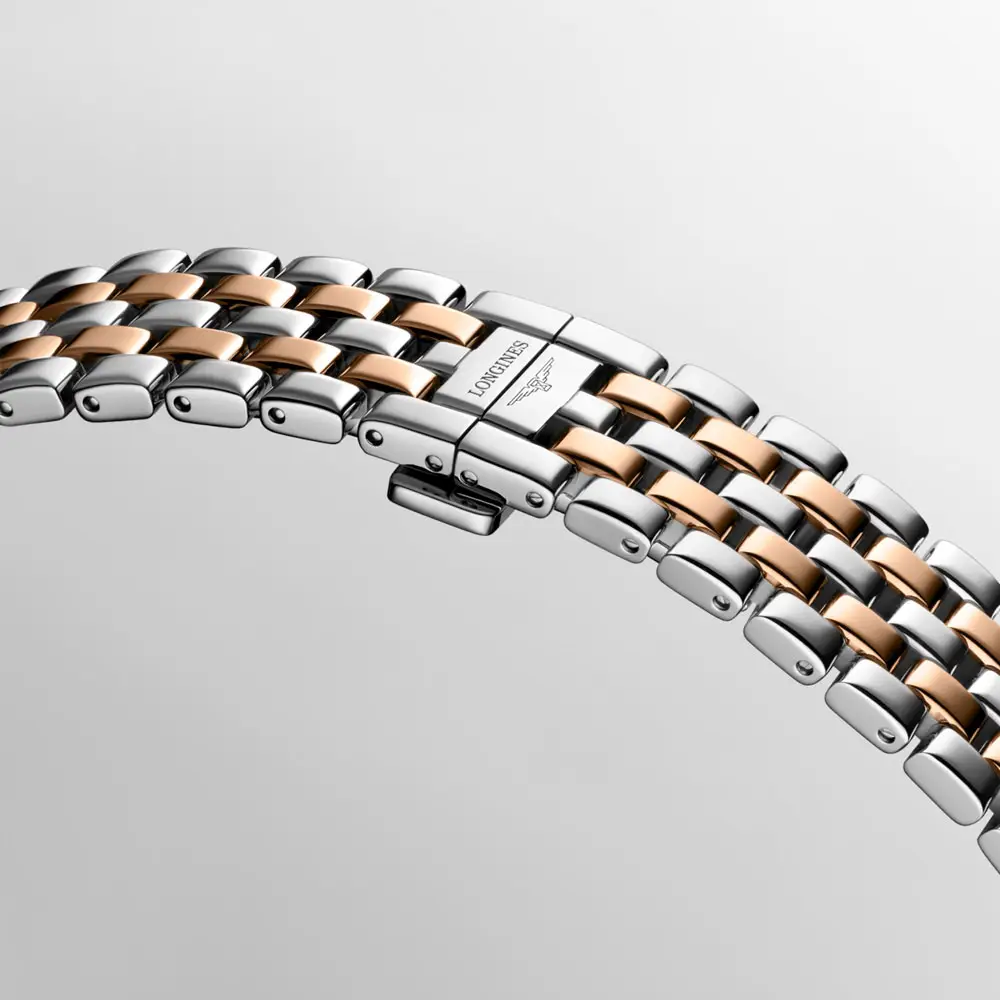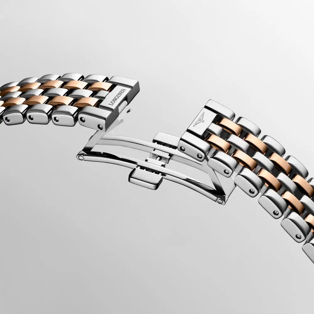 The watch is powered by a quartz movement, caliber L178, ensuring precise and reliable performance. The stainless steel bracelet with rose gold accents and a triple safety folding clasp enhances the luxurious look, while water resistance up to 3 bar (30 m) makes it suitable for everyday use.