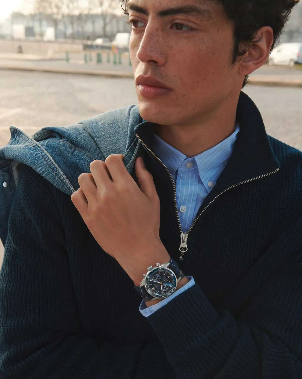 The 42 mm round case, crafted from stainless steel, features a scratch-resistant ceramic bezel, emphasizing its sporty identity. The blue dial is equipped with bold markers, luminous hands, and a flyback chronograph function, ensuring excellent readability in all conditions. A practical date window is located between 4 and 5 o’clock, all protected by a sapphire crystal with anti-reflective coating.