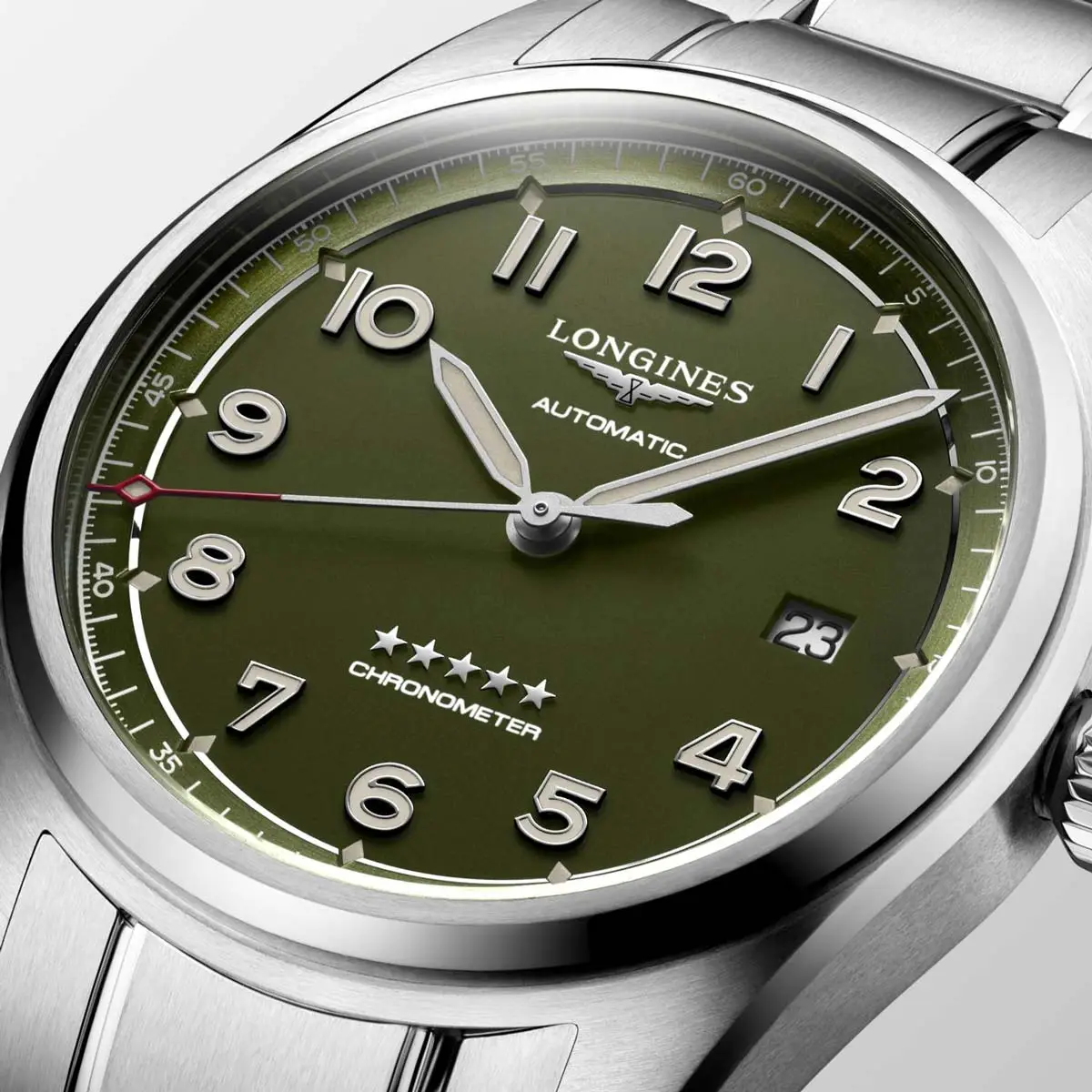 The Longines Spirit L3.810.4.03.6 from the iconic Spirit collection embodies the pioneering heritage of Longines, fused with modern precision and elegance. Its 40 mm round stainless steel case offers a robust and stylish presence, while the green dial with luminescent hands and indices ensures excellent readability both day and night.