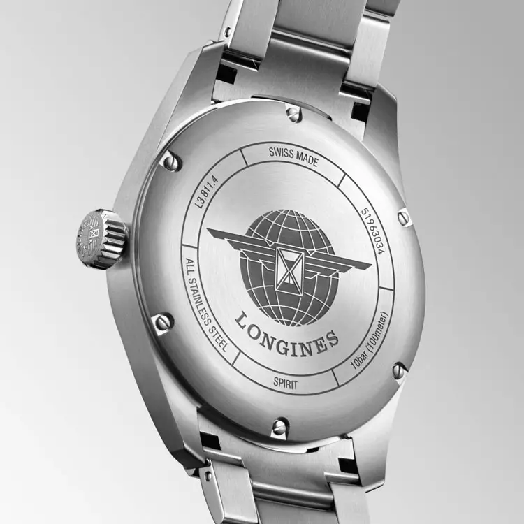 The Longines Spirit L3.811.4.73.6 from the Spirit collection embodies the spirit of aviation blended with timeless elegance. The 42 mm stainless steel case is complemented by sapphire crystal with anti-reflective coating and a screw-in crown.