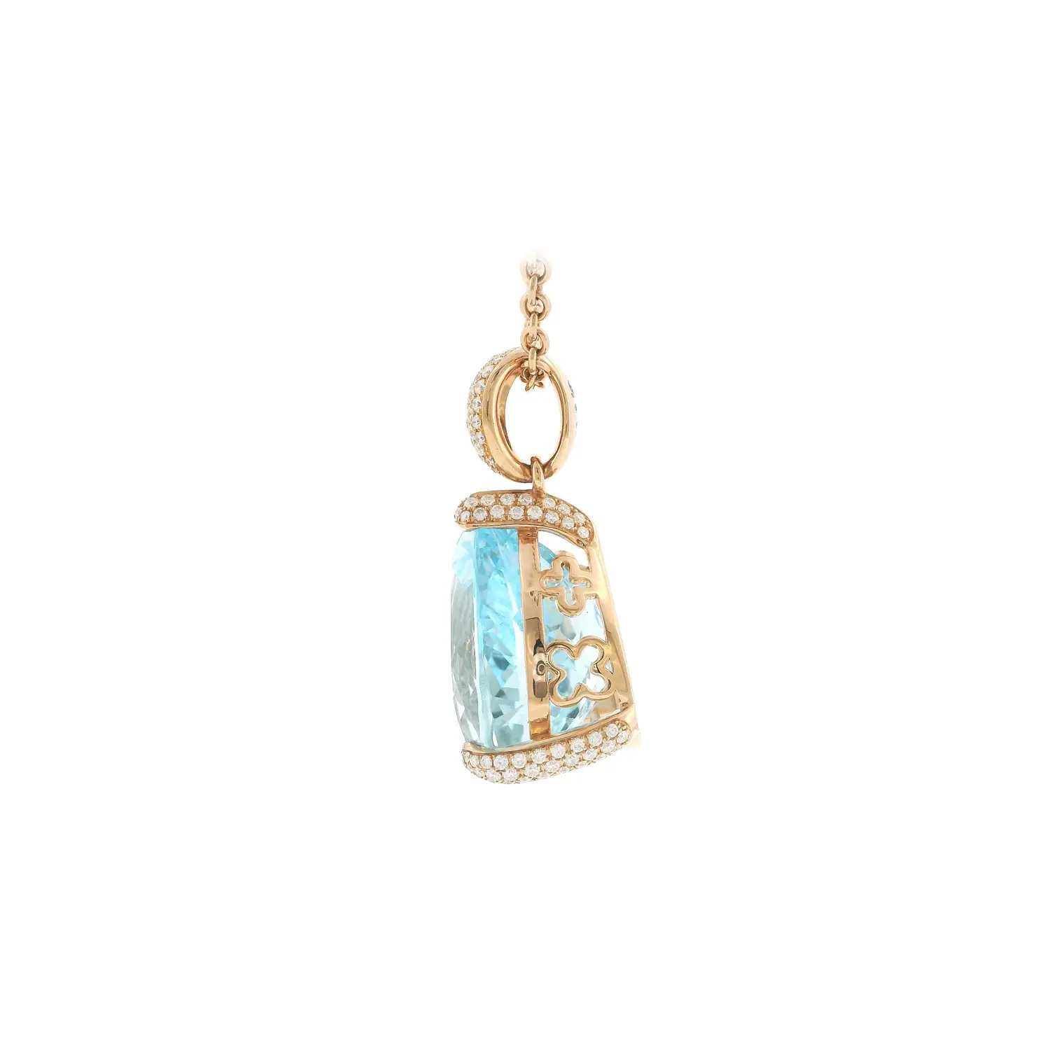 This stunning luxury necklace with blue topaz and diamonds in rose gold is a true expression of sophistication and exclusivity. The centerpiece features a breathtaking blue topaz weighing 52.66 ct, admired for its brilliance, clarity, and captivating play of light that gives the jewel its remarkable presence.