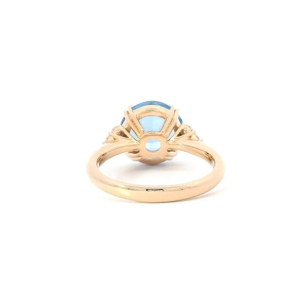 This exceptional 18k rose gold ring impresses at first sight with its large round topaz weighing 5.65 ct, whose rich blue hue shines with dazzling clarity and depth.