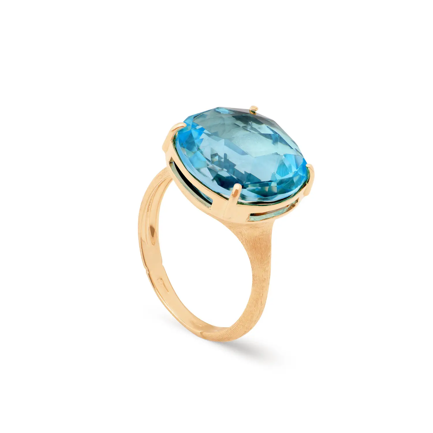 The 18K yellow-gold shank features hand-engraved bulino finishing, creating a silky matte texture with a natural, organic appeal. This artisanal technique, executed entirely by hand, is a hallmark of Marco Bicego and ensures that each piece is unique. The design highlights both the topaz’s colour and the satin sheen of the gold.