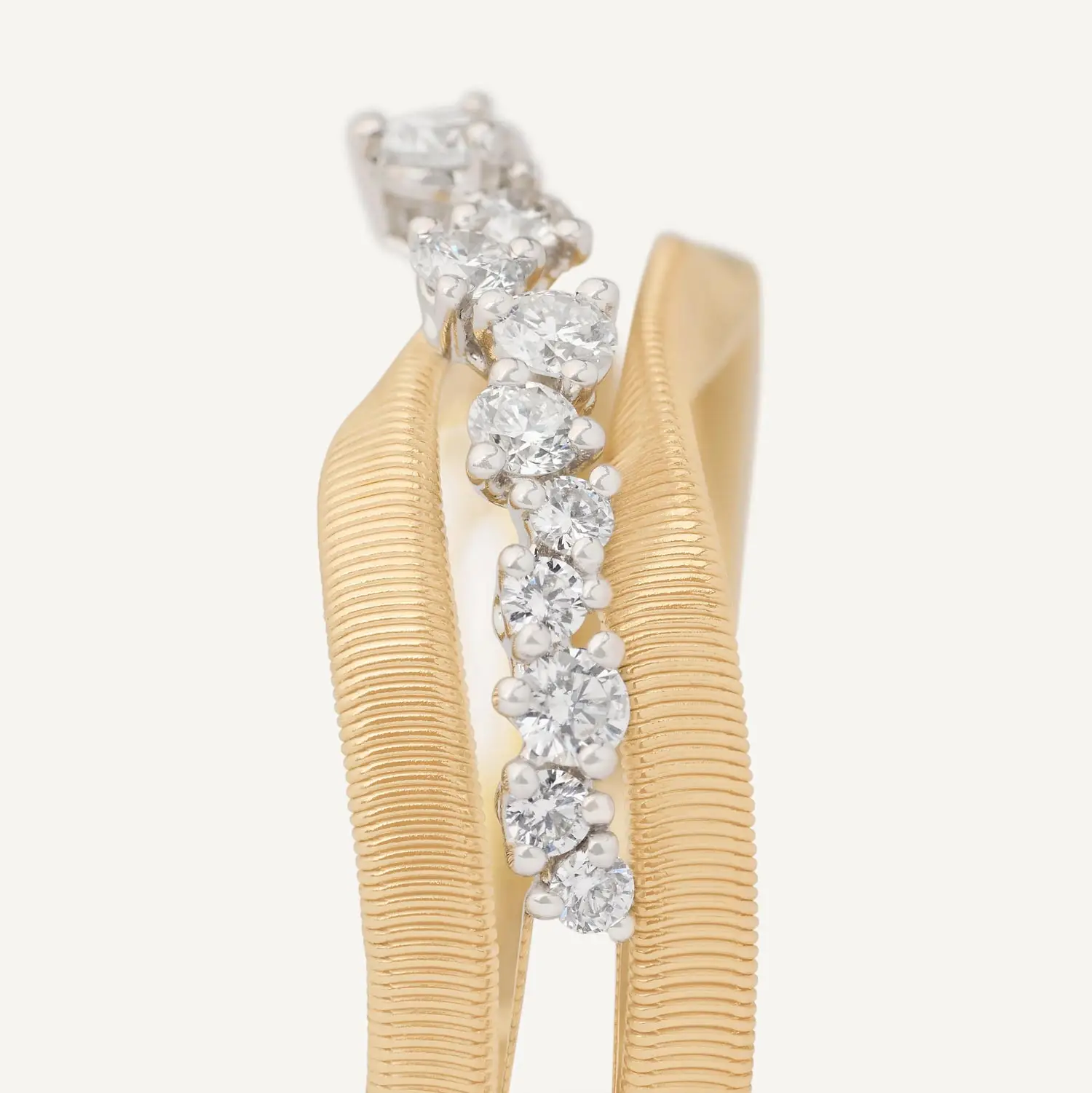 The Marco Bicego ring in 18kt yellow gold with three intertwined strands and a diamond row is an expression of masterful Italian jewelry craftsmanship and refined attention to detail. The organically shaped gold strands flow naturally into one another, creating a sculptural, dynamic effect that is iconic for the Marco Bicego brand. A delicate row of diamonds adds a sophisticated sparkle and an elegant contrast to the warm tone of yellow gold.