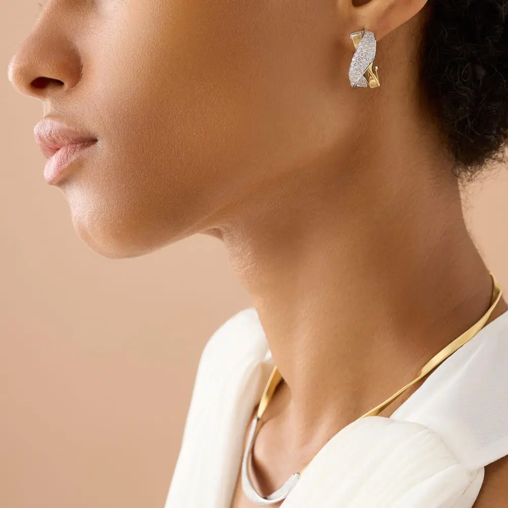 A central feature of the design is the diamond pavé detailing, with brilliant-cut diamonds set along the twisted gold strands. The stones bring light and sparkle to the earrings, enhancing their sophistication while retaining a balanced, understated elegance.