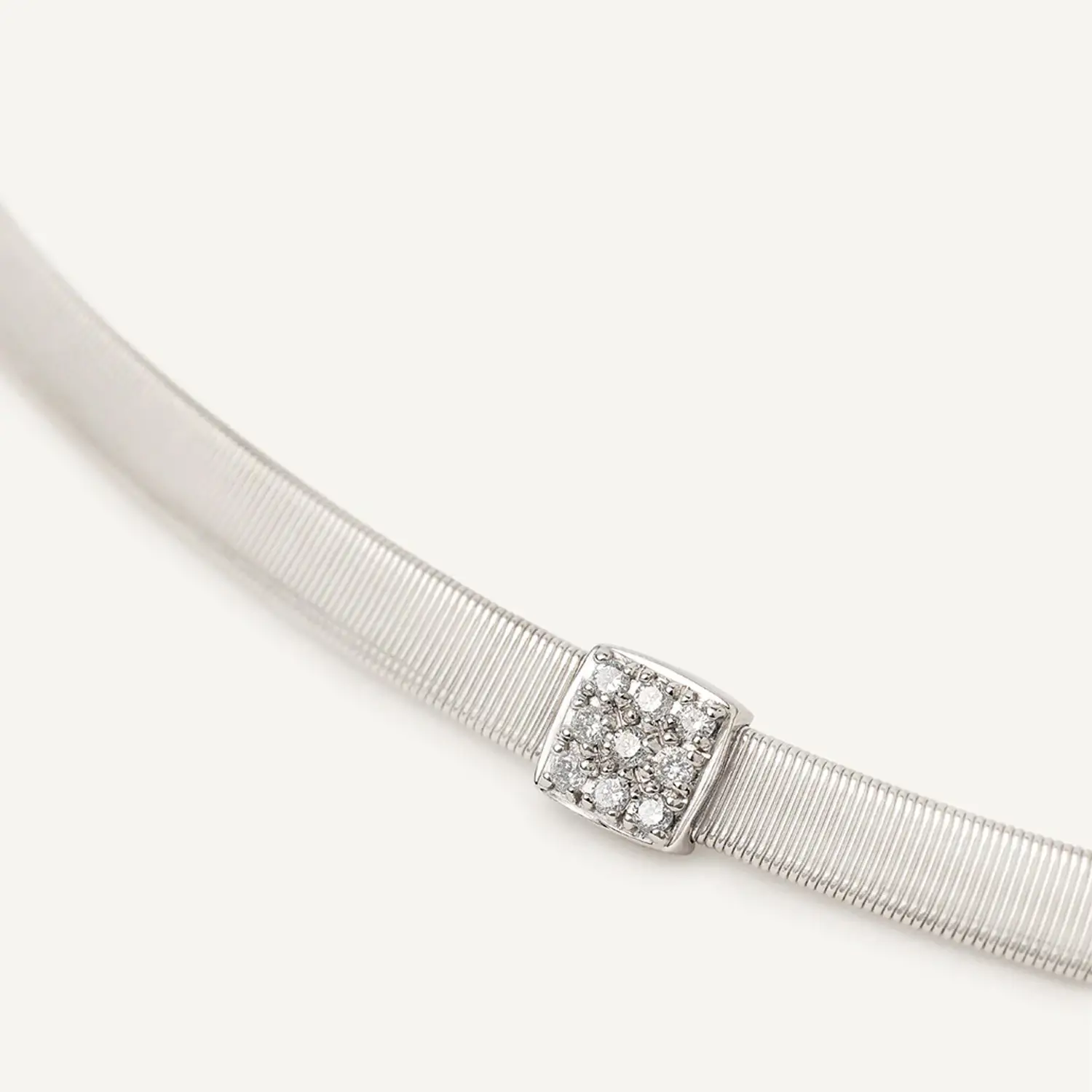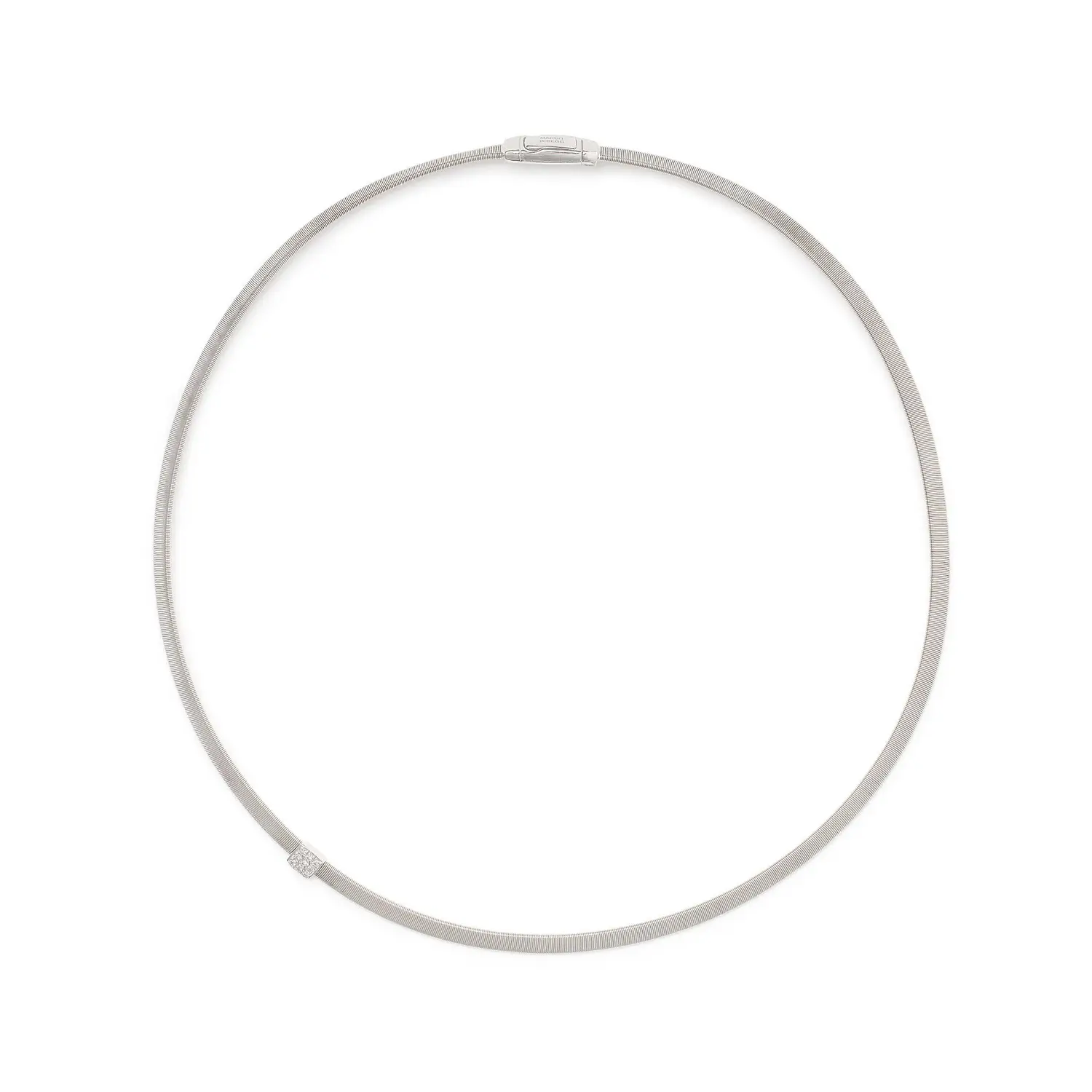 This elegant necklace from the Masai collection by Marco Bicego embodies modern minimalism and Italian sophistication. Crafted in 18 k white gold and adorned with a pavé of brilliant-cut diamonds totaling approximately 0.07 ct, it exudes understated luxury. Inspired by the African Masai culture, the design reflects purity, strength, and effortless grace.