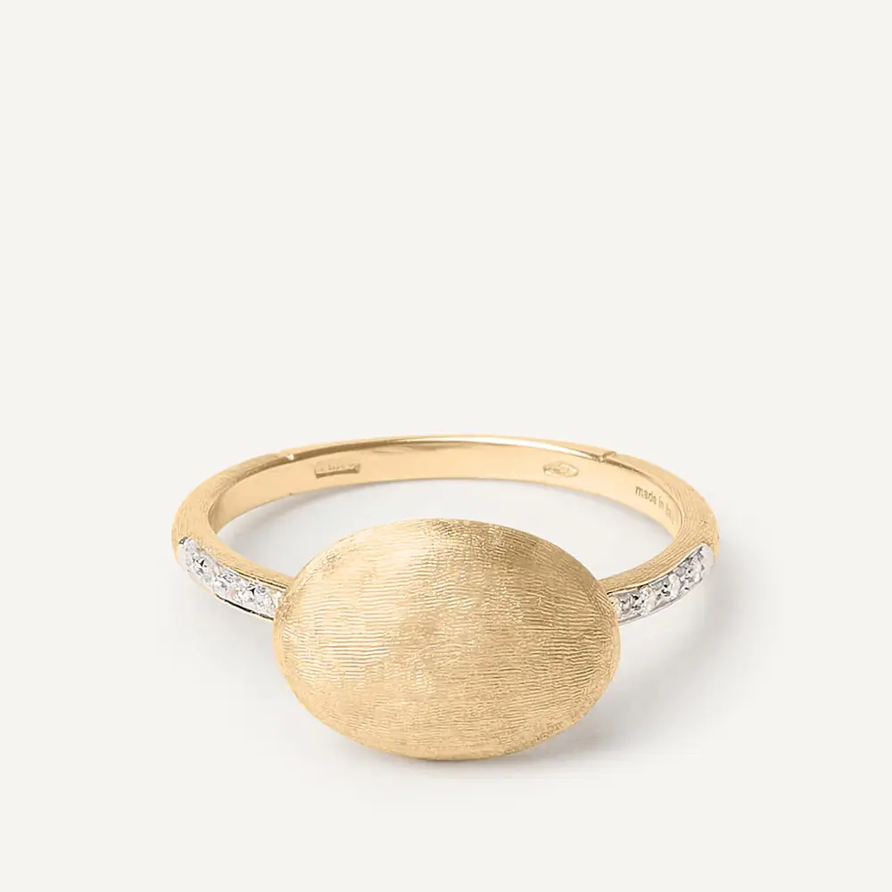 The Marco Bicego Siviglia AB609 B YW ring blends organic lines with traditional Italian goldsmithing. The Siviglia collection is defined by its oval motifs inspired by Andalusian aesthetics and understated elegance. The central 18K yellow-gold element features a gently irregular silhouette and a hand-engraved satin finish, adding a refined texture.