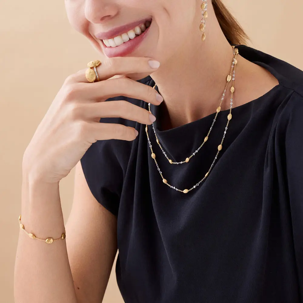 Each piece is handcrafted in Marco Bicego’s ateliers and decorated with the hand-engraved bulino technique, which creates a silky matte surface. The delicate gold elements are connected by airy chains that move naturally with the body. The Siviglia collection includes necklaces, bracelets, earrings, and rings, often enriched with diamonds for added sophistication.