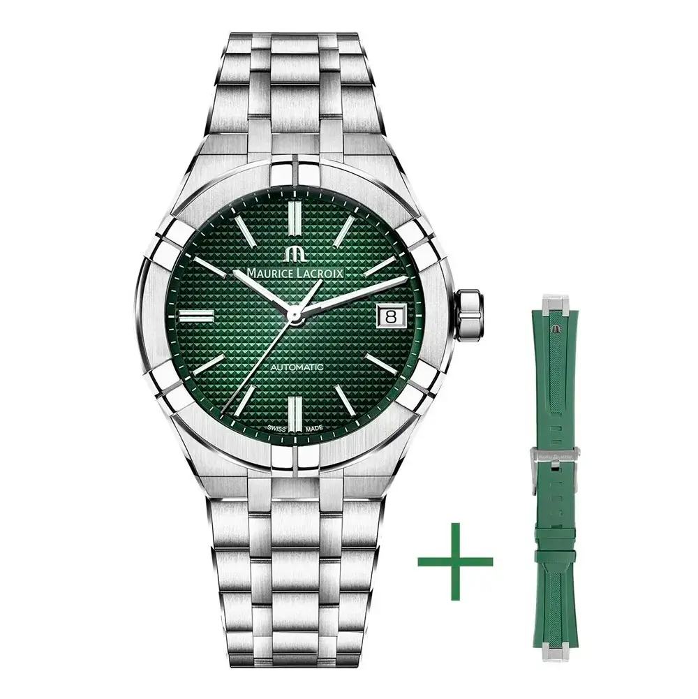 The Maurice Lacroix Aikon Automatic Date 39mm AI6007-SS00F-630-D combines elegance, technical precision, and modern design in a compact form. Part of the iconic Aikon collection, it features bold lines, the signature six-arm bezel, and a distinctive green Clous de Paris dial, adding depth and originality.