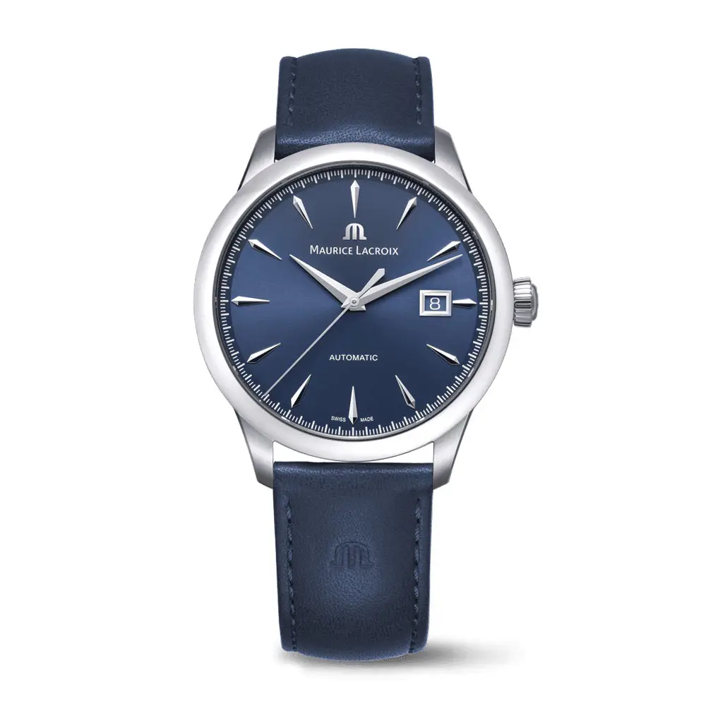 The Maurice Lacroix 1975 Automatic is a modern reinterpretation of a classic design that pays homage to the brand's roots. The 40mm stainless steel case combines polished and brushed surfaces to create a harmonious, elegant look. The dial in deep blue with a sunburst effect is complemented by dauphine hands, trapezoidal indices and a date window at position 3.