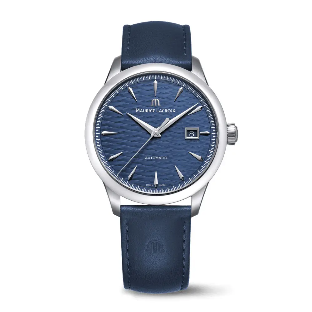 Its deep blue dial features the signature “Vagues du Jura” pattern, highlighted by rhodium-plated hands and indexes that enhance the model’s refined character. A practical date window at 3 o’clock adds functionality while maintaining visual balance.