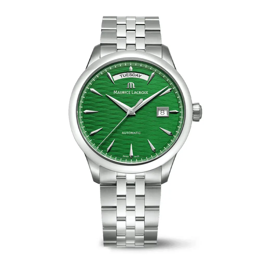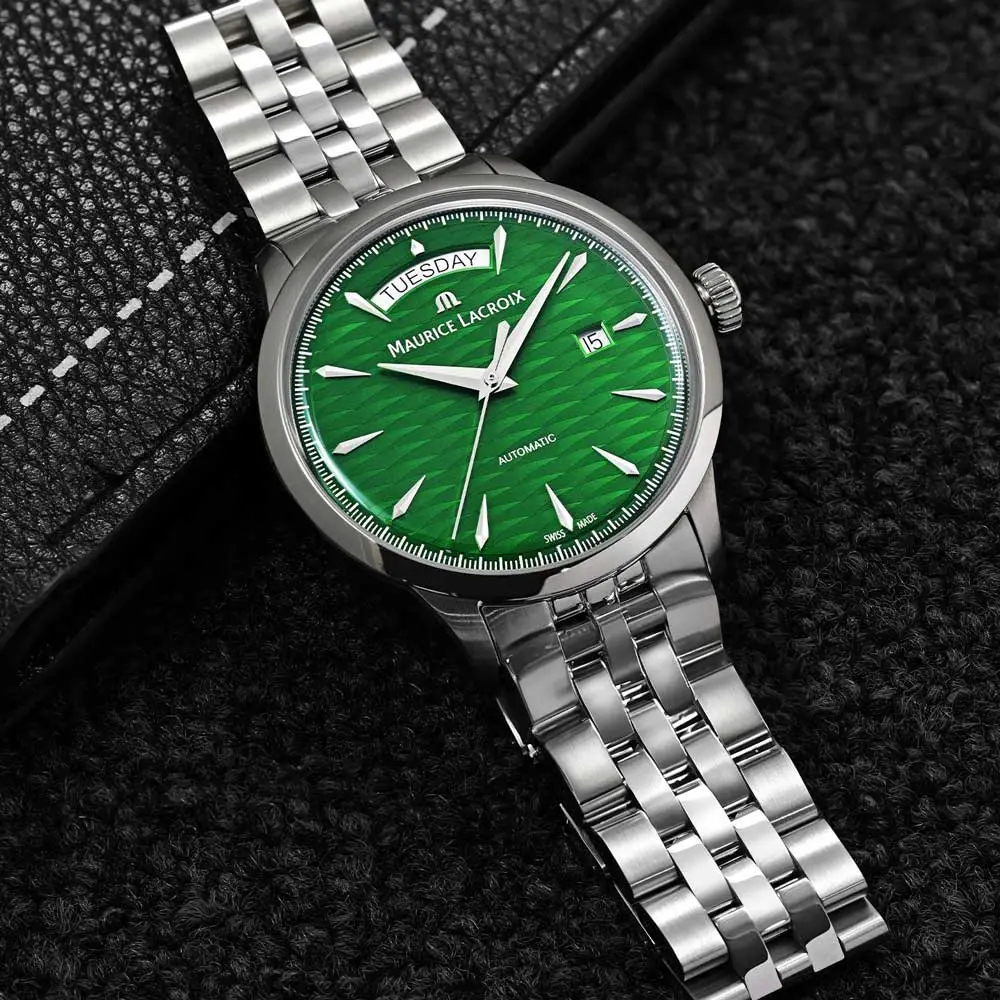 The Maurice Lacroix 1975 Automatic Vagues du Jura Limited Edition 756058-SS002-630-1 pays tribute to the Swiss Jura region, where the brand was founded. This exceptional model from the 1975 collection features a distinctive green dial with the embossed Vagues du Jura pattern inspired by the rolling hills of Franches-Montagnes. It is produced as a limited edition of 500 pieces worldwide, making it highly collectible.