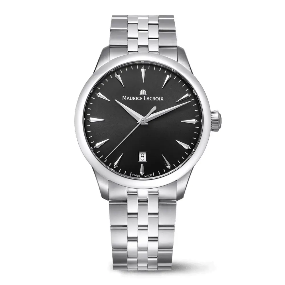 The Maurice Lacroix 1975 Quartz 39 mm (ref. 751007-SS002-330-1) is a timeless model that blends retro design with modern Swiss precision. Inspired by the style of the 1970s, it offers a refined look suitable for both everyday wear and formal occasions. The 39 mm stainless steel round case fits comfortably on the wrist, while the scratch-resistant sapphire crystal protects a clean black analog dial with contrasting hands and indices.