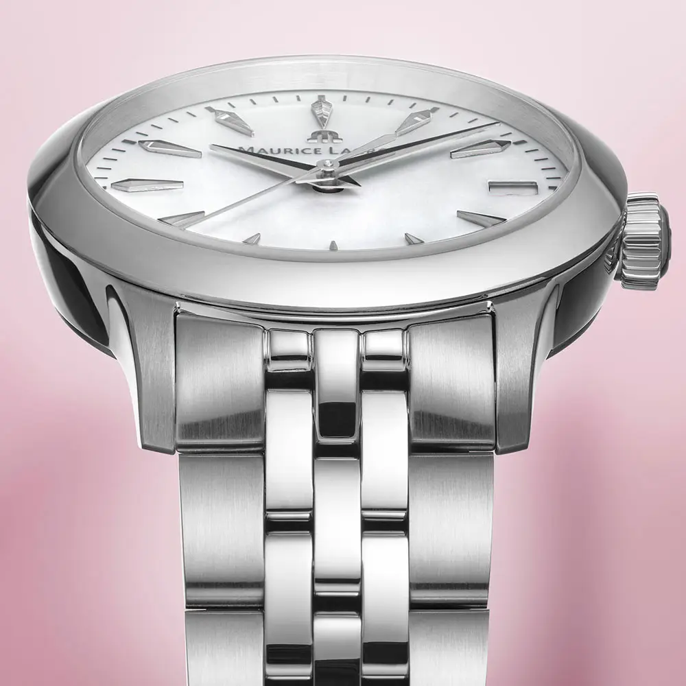 The Maurice Lacroix 1975 Quartz 33 mm (751006-SS002-160-1) ladies’ watch combines Swiss precision with timeless elegance. The 33 mm stainless steel case with polished and brushed surfaces gives the watch a refined appearance and makes it ideal for slimmer wrists. The model features a delicate white mother-of-pearl dial, complemented by rhodium-plated hands and hour markers for excellent readability.