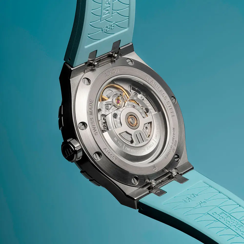 Powered by the automatic ML115 caliber with a 38-hour power reserve, the watch ensures smooth Swiss precision. With 20 ATM (200 m) water resistance, it’s suitable for swimming and water sports. The integrated stainless steel bracelet with folding clasp completes the harmonious design of this luxurious and refreshing Aikon Summer Edition.