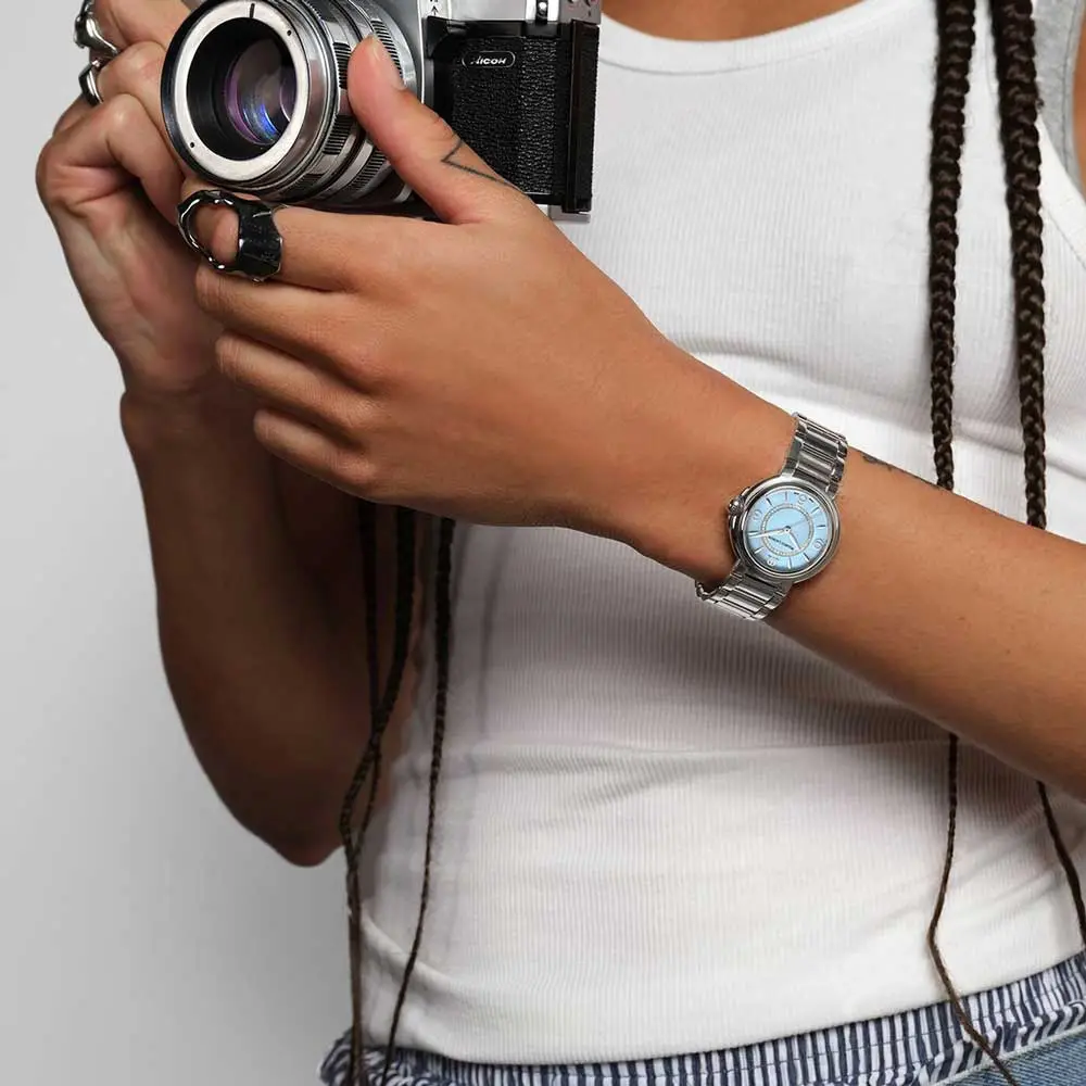 The light blue dial is adorned with 46 sparkling diamonds and elegant Arabic numerals, adding a touch of luxury and individuality. The anti-reflective sapphire crystal protects the dial while enhancing the brilliance of the gemstones.