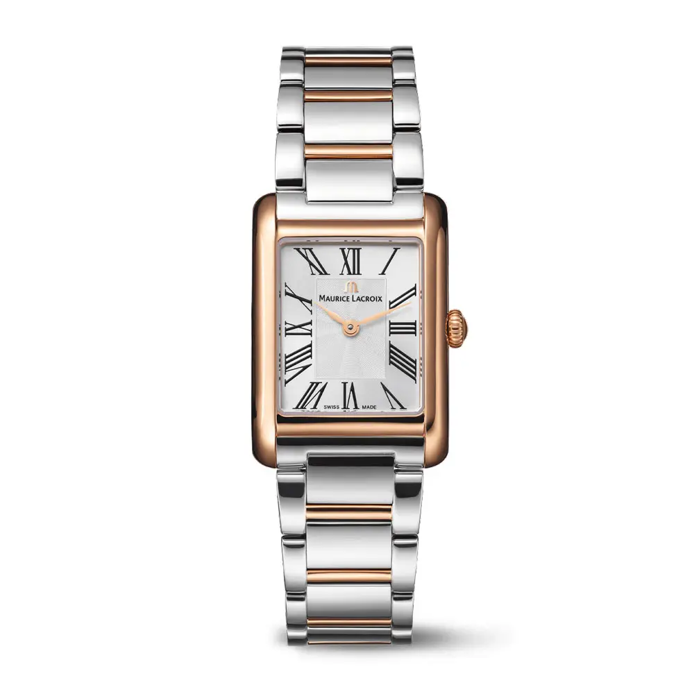 The Maurice Lacroix Fiaba Square FA1205-PVP02-110-A is an elegant ladies' watch that combines fine lines, Swiss precision and a sophisticated two-tone design. The rectangular case, measuring 24×34 mm, is made of polished steel and enhanced with a rose gold PVD finish that gives the model a luxurious look. Thanks to its height of just 6.5 mm, the watch looks extremely subtle.