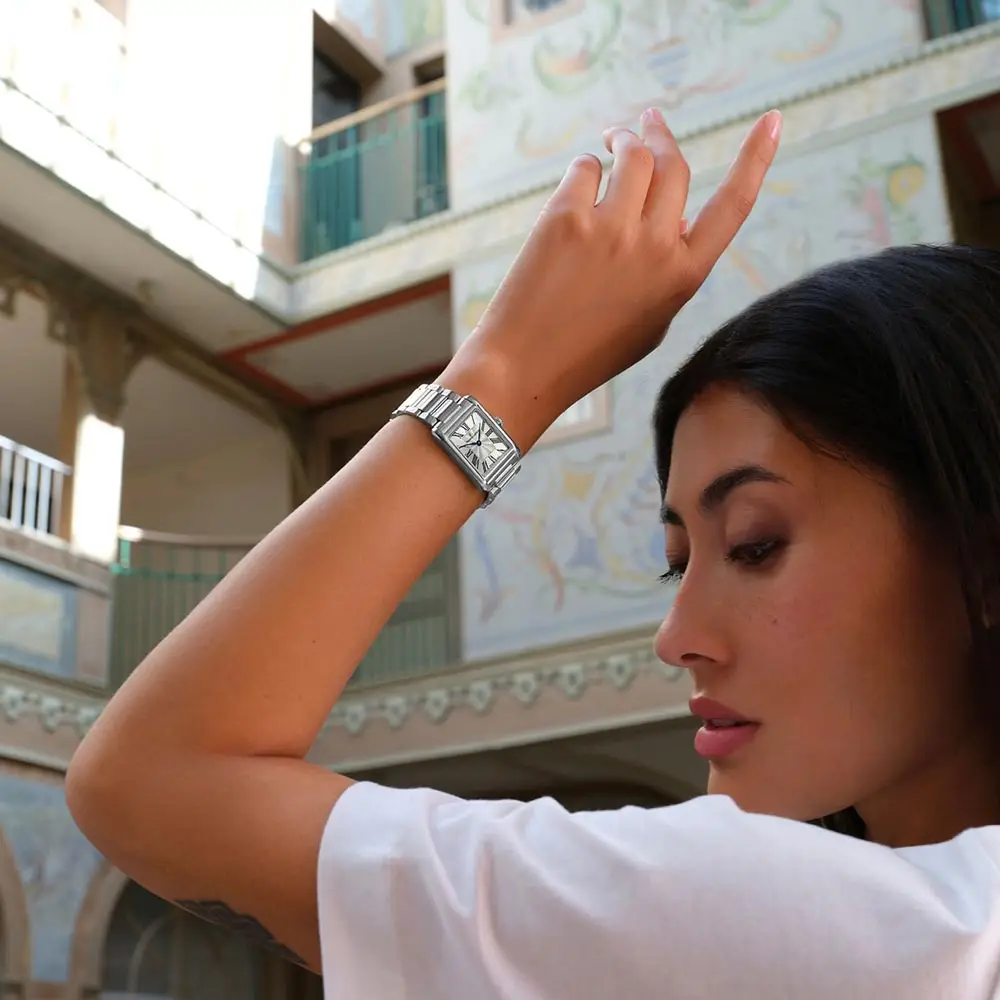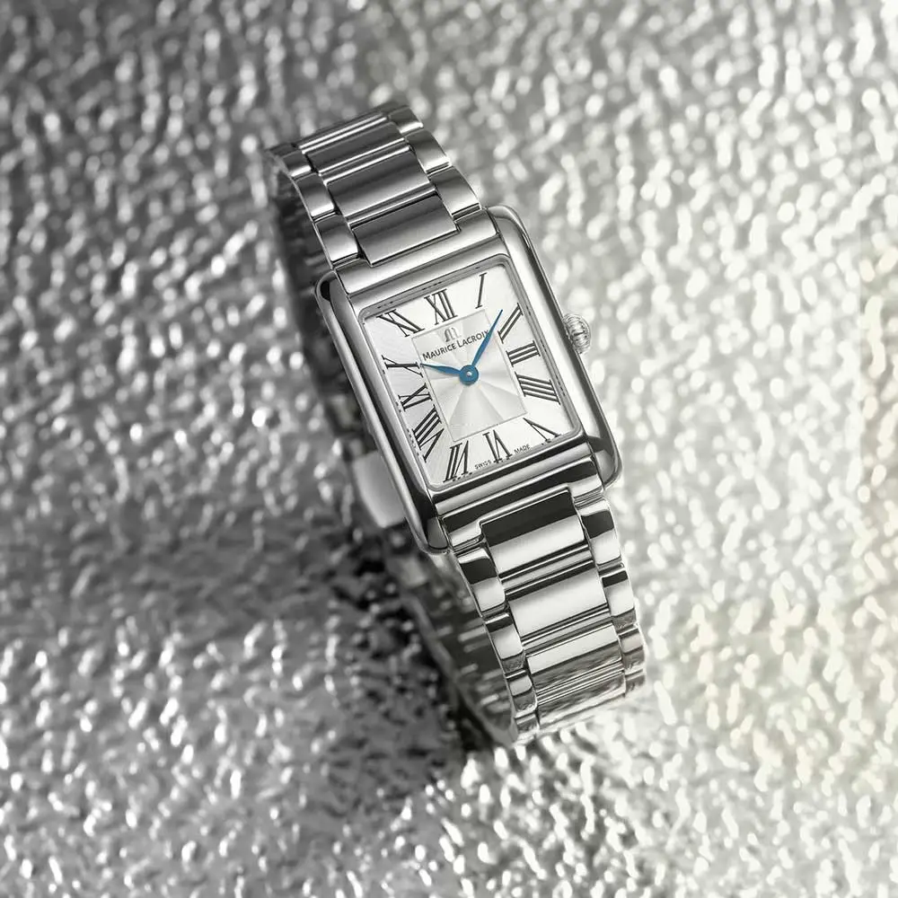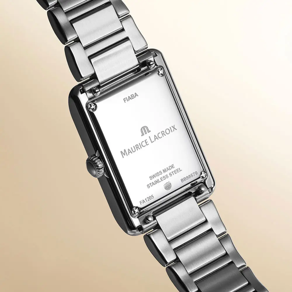 The Maurice Lacroix Fiaba Square FA1205-SS002-110-1 embodies elegance and refinement in a modern square format. The polished steel case measuring 24 × 34 mm looks subtle and feminine on the wrist. With its curved lines and subtle proportions, the watch is perfect for everyday wear and formal occasions.