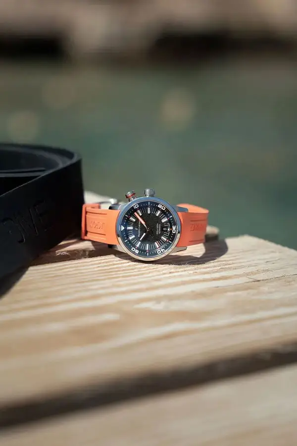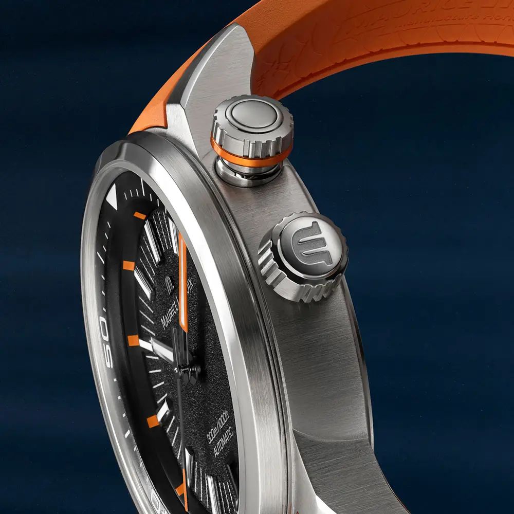 The 42 mm stainless steel case combines polished and brushed surfaces, giving it a strong yet refined appearance. The black dial with Super-LumiNova hands and indexes ensures excellent legibility underwater. A sapphire crystal with double anti-reflective coating protects the dial, while the internal rotating bezel allows precise dive-time measurement.