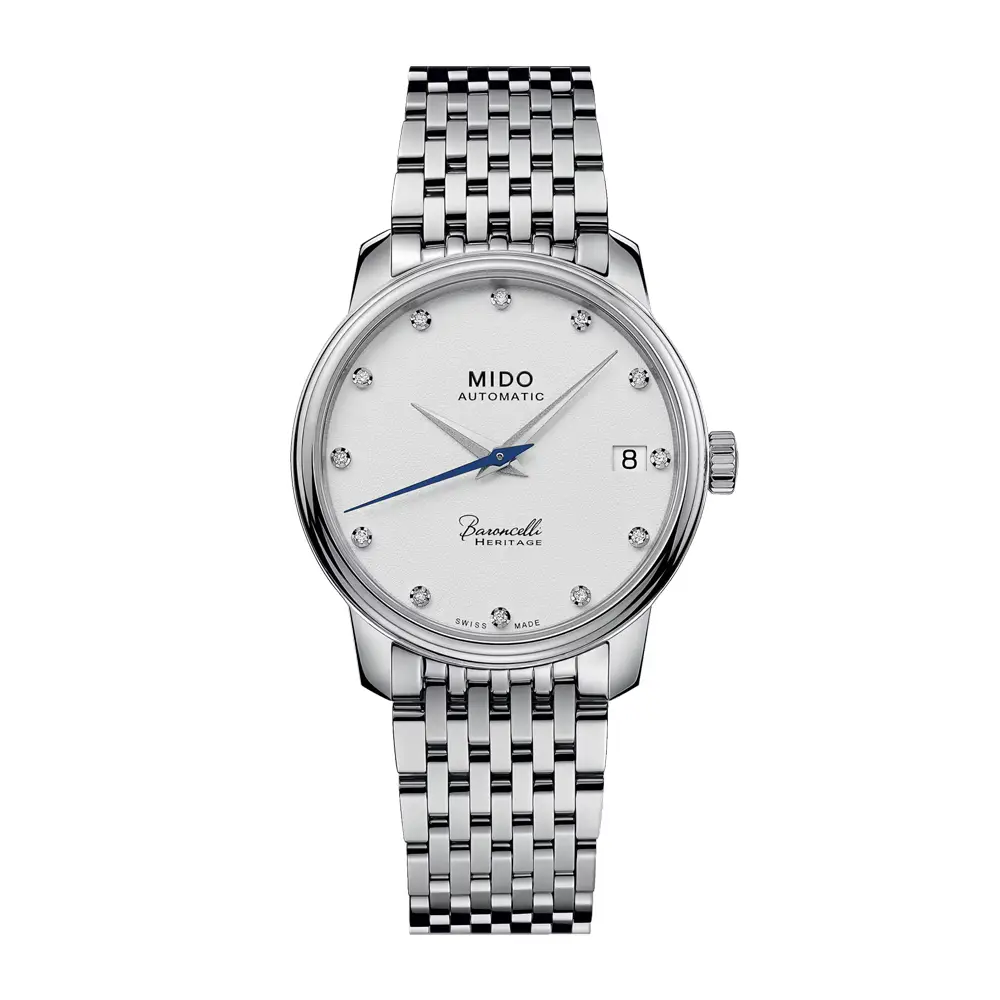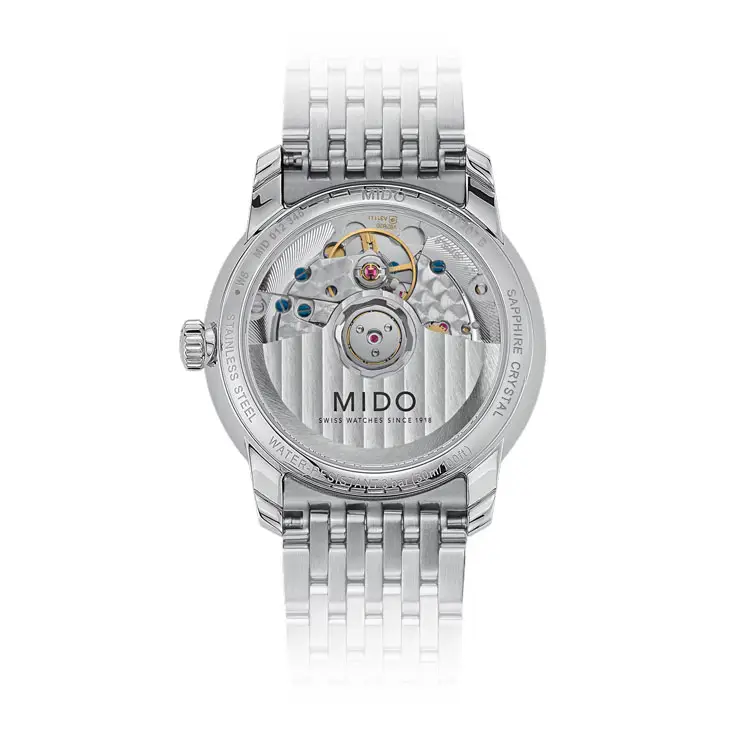 The Mido Baroncelli Heritage Lady is an elegant ladies’ model that combines classic style, subtle details, and Swiss precision. Its round case with a diameter of 33 mm is made of high-quality stainless steel and protected by a durable sapphire crystal, ensuring excellent protection and dial legibility.
