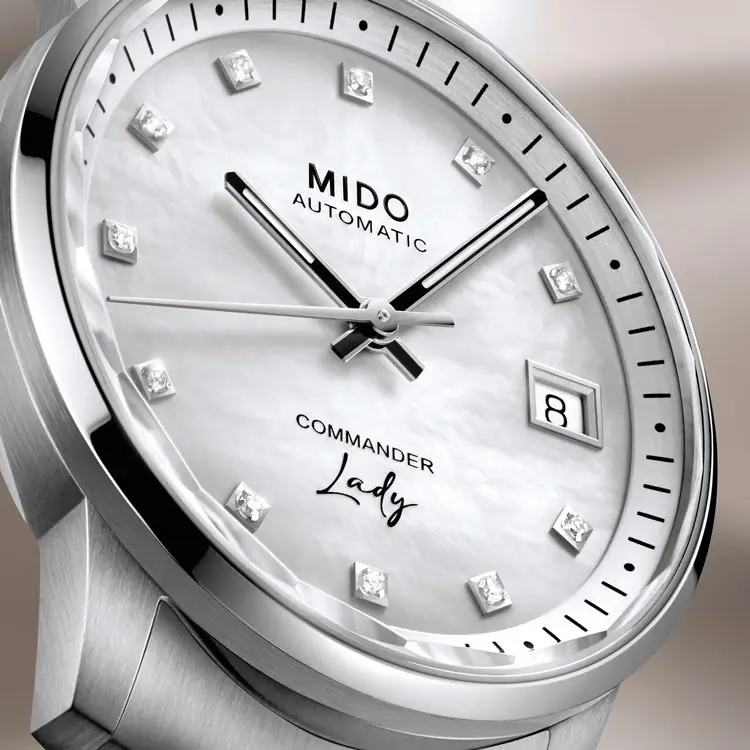 The Mido Commander Lady is an elegant model designed for modern women who appreciate the combination of refined design and Swiss precision. Its classic round case with a diameter of 35 mm is made of high-quality stainless steel and protected by a durable sapphire crystal, ensuring perfect legibility and scratch resistance.