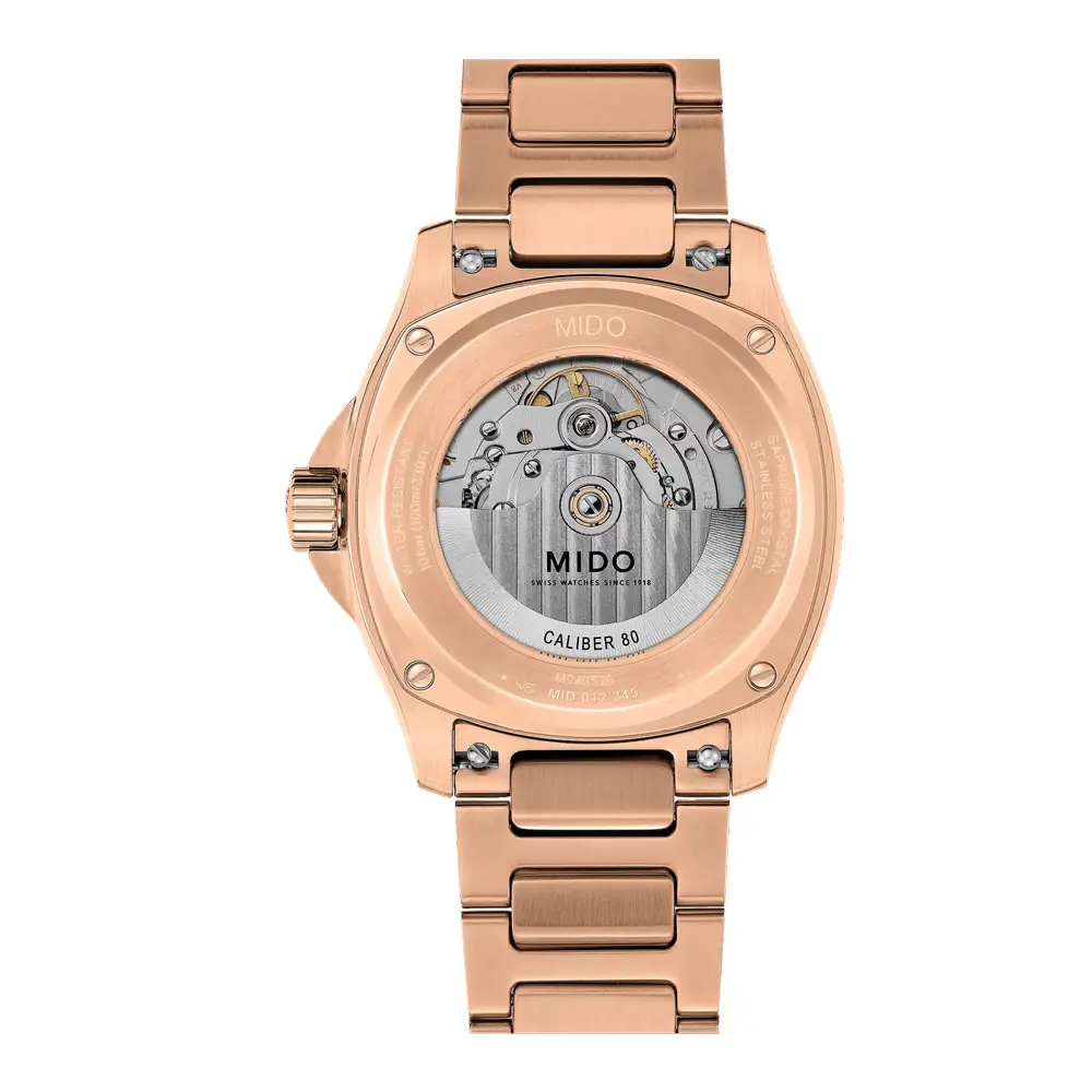 At its heart is the reliable Mido Caliber 80 automatic movement with an impressive power reserve of up to 80 hours, delivering long-lasting performance and precision. The modern Nivachron balance spring improves resistance to magnetic fields and shocks. A standout feature is the Big Date display at 12 o’clock, offering excellent legibility and a distinctive character. The transparent case back reveals the mechanical movement.