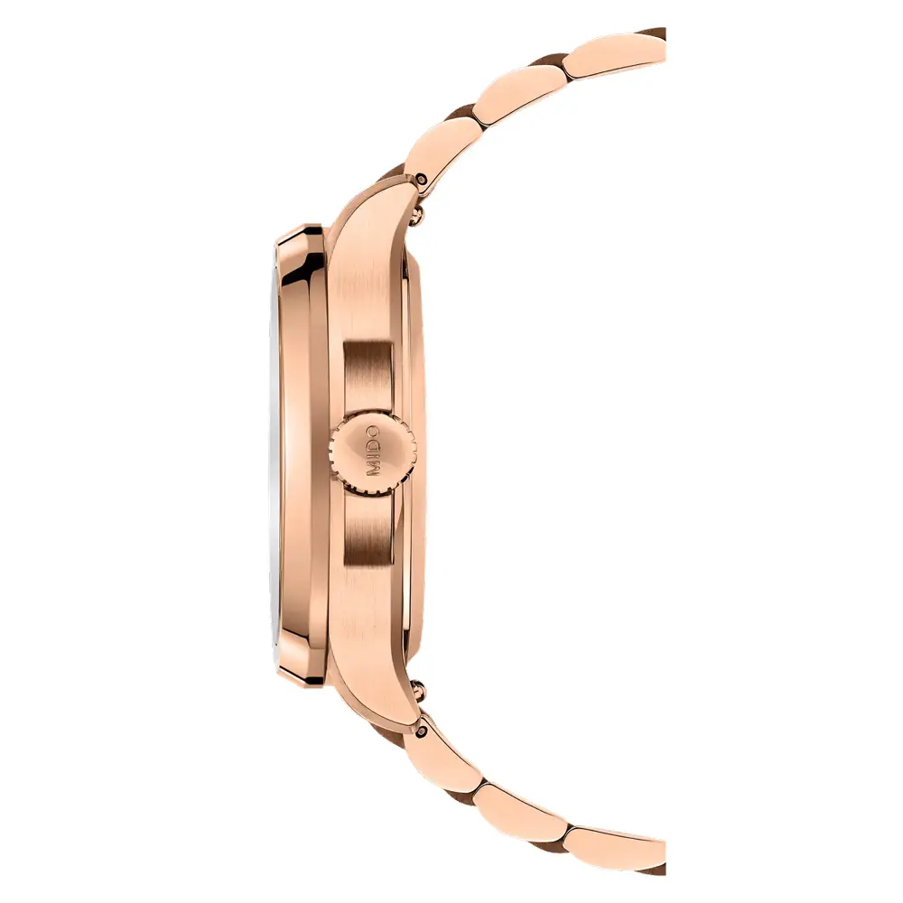 The Mido Multifort TV Big Date M049.526.33.041.00 stands out with its unique retro design inspired by 1970s television screens. The distinctive TV-shaped case (40 × 39.2 mm) made of 316L stainless steel with rose gold PVD coating gives the watch a bold and modern look. The scratch-resistant sapphire crystal with double anti-reflective coating ensures excellent readability, while 100 m (10 bar) water resistance makes it suitable for everyday wear.
