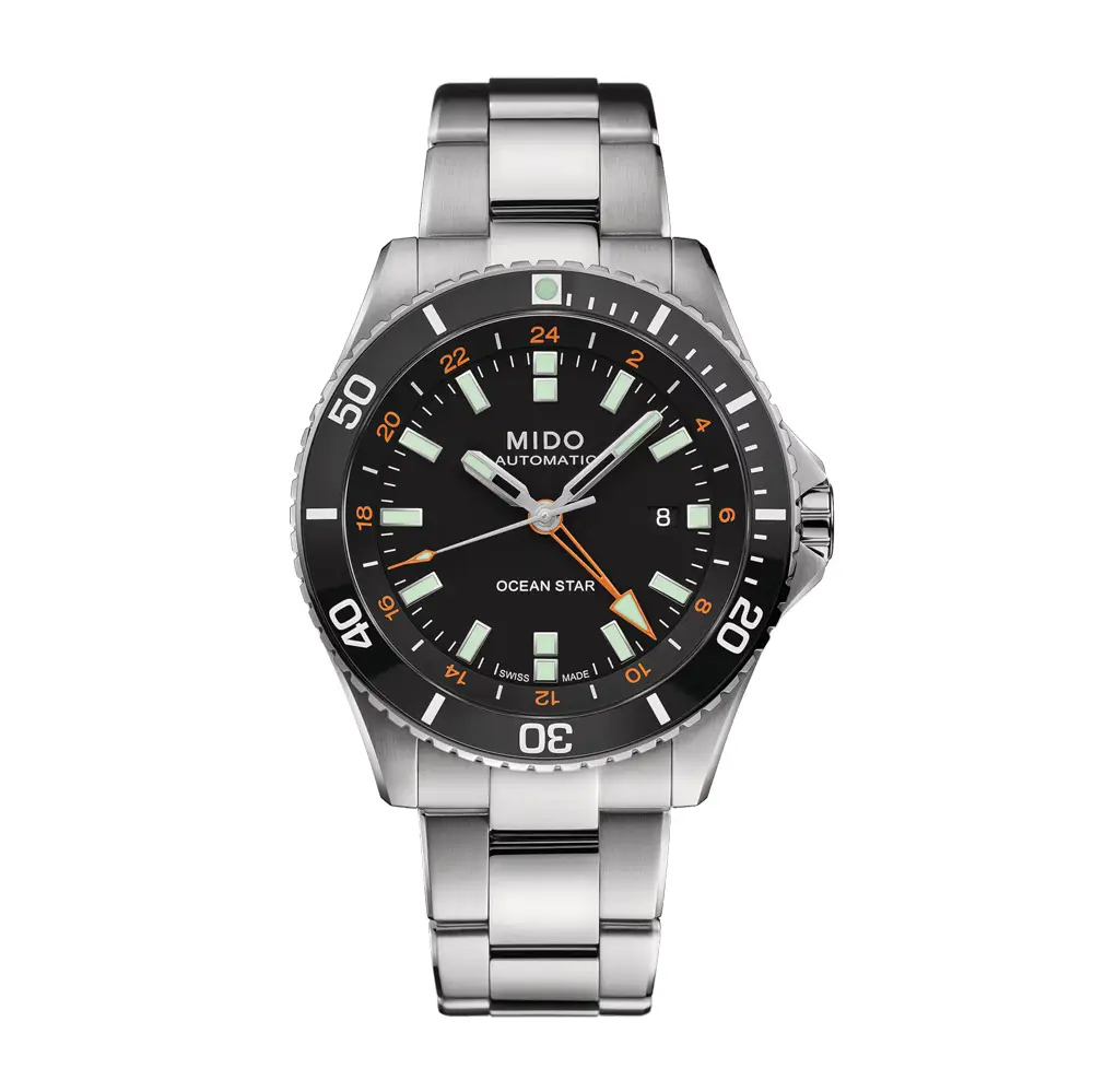 The Mido Ocean Star GMT represents the perfect blend of sporty functionality and elegant design, ideal not only for travelers. Its robust round case with a diameter of 44 mm is made of high-quality stainless steel and protected by a durable sapphire crystal, ensuring excellent durability and perfect legibility.