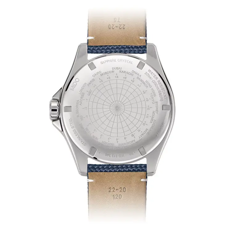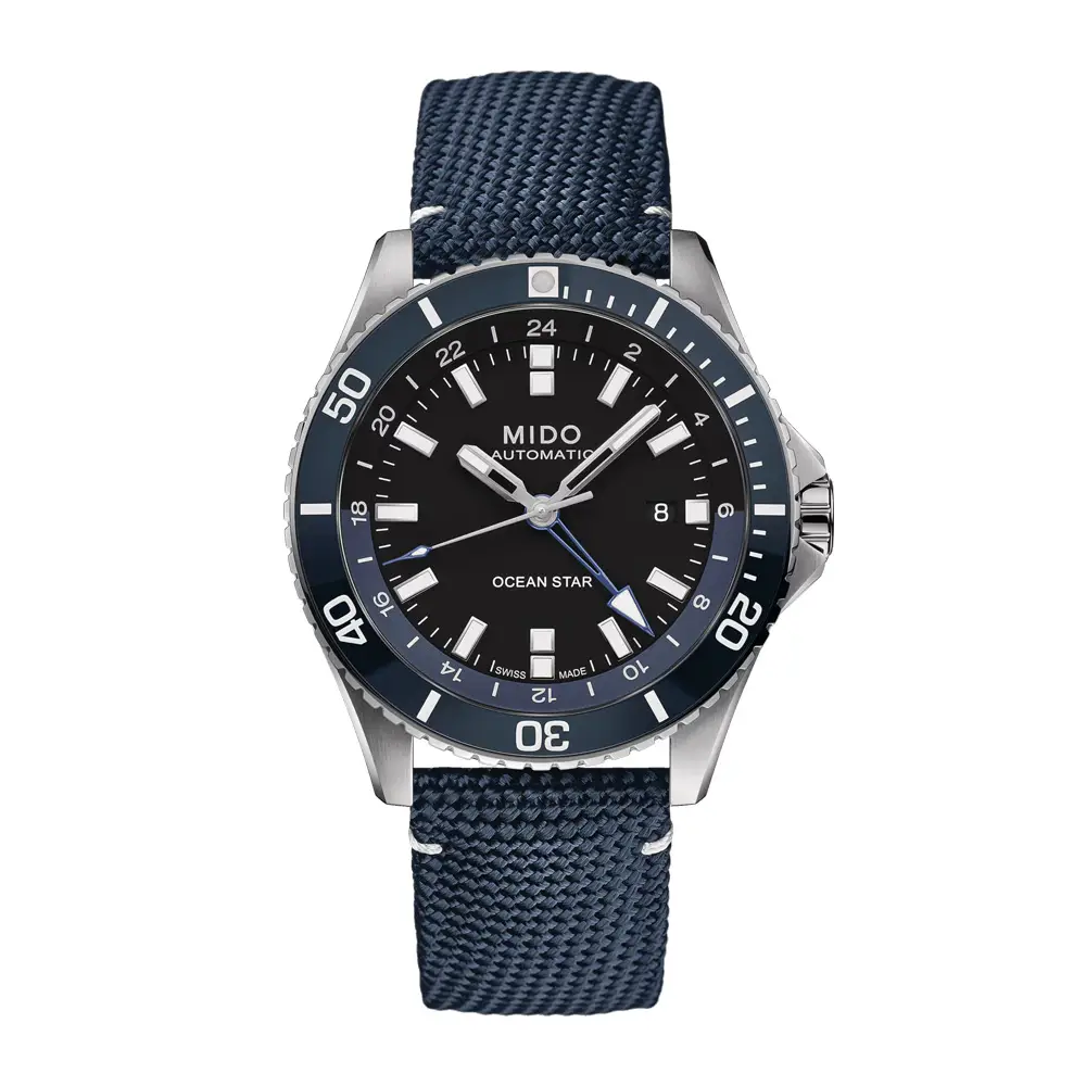 The Mido Ocean Star GMT is an excellent combination of sports functionality, travel-inspired design, and Swiss precision. Its modern round case with a diameter of 44 mm is made of high-quality stainless steel and protected by sapphire crystal, ensuring great protection and perfect dial legibility. The durable ceramic bezel accentuates its robust character and contributes to long-lasting shine and durability.