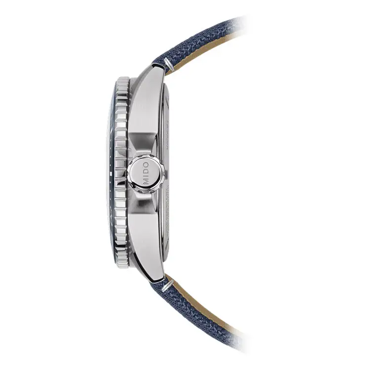 The clean and durable design extends to the details — a blue textile strap with a pin buckle ensures comfortable and secure wear. With water resistance of 20 ATM (200 meters), the watch is suitable not only for everyday wear but also for swimming and snorkeling.