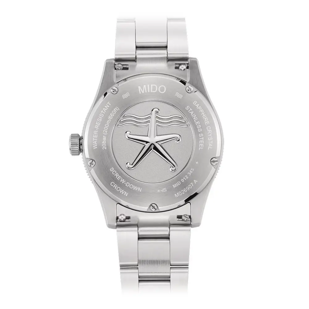 The model is powered by the innovative automatic caliber Caliber 72 (ETA development A31.111) with a power reserve of up to 72 hours and equipped with a Nivachron™ antimagnetic spring, which ensures long-term accuracy and reliability. Water resistance to 200 m, together with the screw-down crown and starfish-embossed caseback, reflect Mido's heritage and expertise in diving watches.