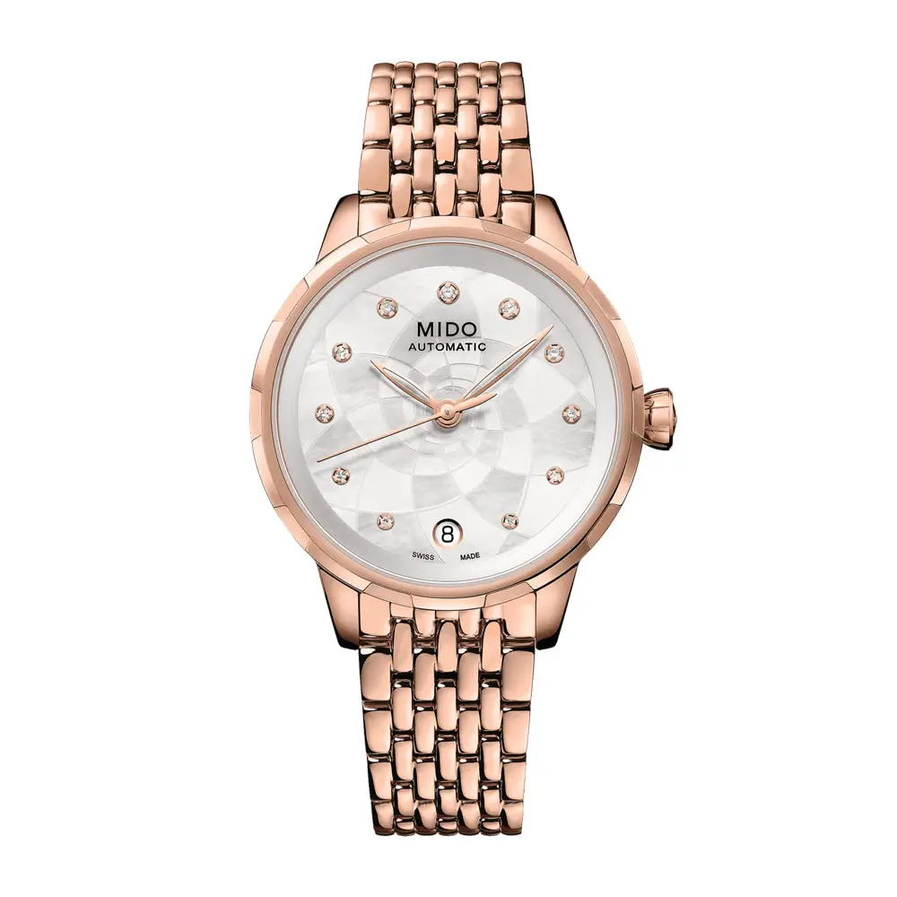 The Mido Rainflower is the embodiment of feminine elegance and delicacy, inspired by natural shapes and details. Its round case with a diameter of 34 mm is made of high-quality stainless steel with rose gold PVD coating, giving the model a sophisticated and modern look. The same bicolor style is reflected in the bezel and the elegant stainless steel bracelet with rose gold accents, finished with a comfortable folding clasp.