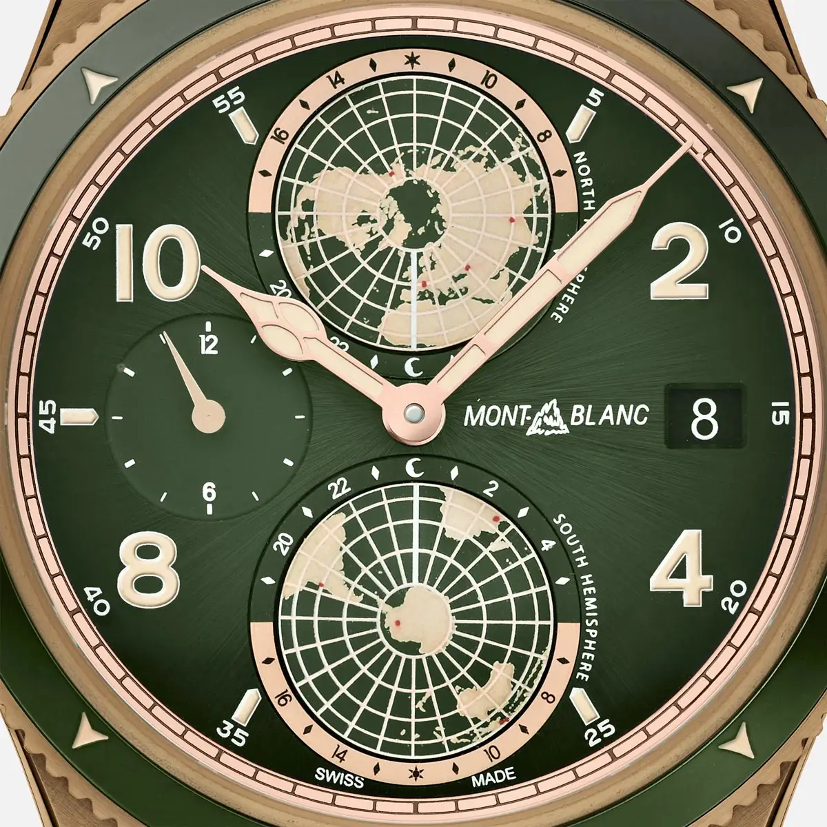 The Montblanc 1858 Geosphere Limited Edition 119909 is a unique adventure model inspired by extreme expeditions and iconic ascents of the world’s highest peaks. The 42 mm round case made of bronze develops a distinctive patina over time, reflecting each wearer’s journey. A ceramic bezel and sapphire crystal ensure high durability and clarity in demanding conditions.