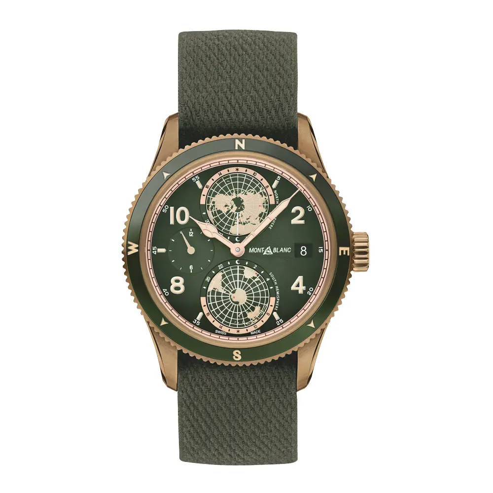 The watch is water-resistant to 10 ATM (100 m) and comes with a robust green textile strap with pin buckle, underscoring its expedition character. The Montblanc 1858 Geosphere 119909 is a limited edition for true adventurers, combining technical sophistication with an authentic spirit of exploration.