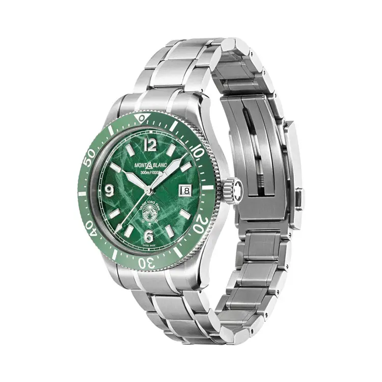 The Montblanc 1858 Iced Sea Automatic Date 129373 stands out with its bold design and exceptional durability, making it an ideal choice for both divers and mountain enthusiasts. The 41 mm round stainless steel case is fitted with sapphire crystal and features a striking green ceramic bezel that complements the deep green dial inspired by frozen lakes. The robust silver-tone stainless steel bracelet with a folding clasp ensures secure and comfortable wear.