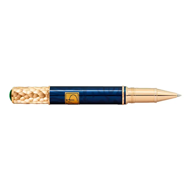 The pen features a barrel of translucent dark-blue lacquer, with a cap and fittings coated in yellow gold. Its hammered texture reflects the shimmering surface of Klimt’s masterpieces, while a synthetic green spinel at the base symbolizes spring and renewal.