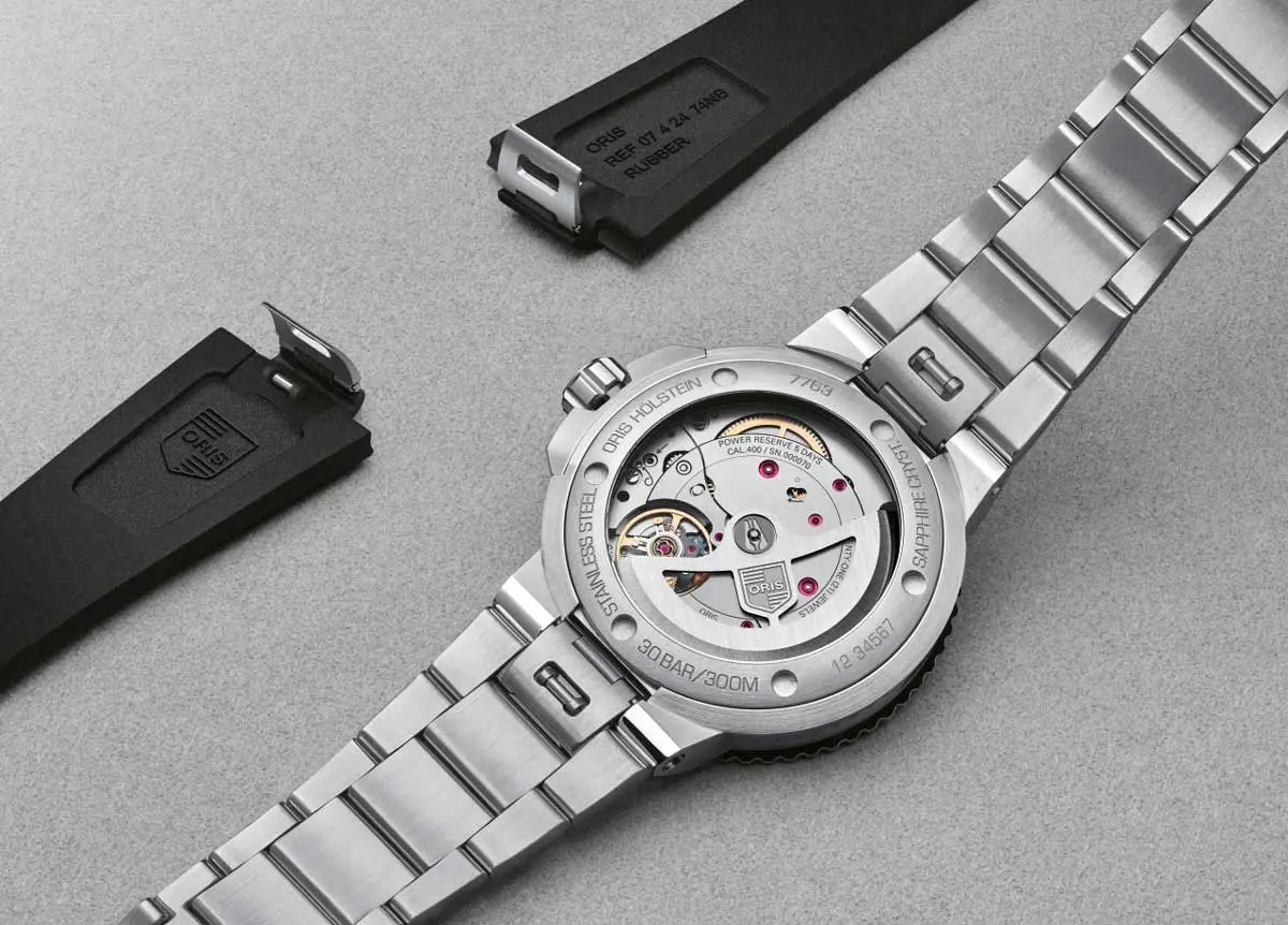 At its heart beats the in-house Oris Calibre 400, offering an impressive power reserve of 120 hours (5 days), high magnetic resistance, and extended service intervals. The date window at 6 o’clock adds functional balance, while the transparent case back reveals the beautifully finished movement.
