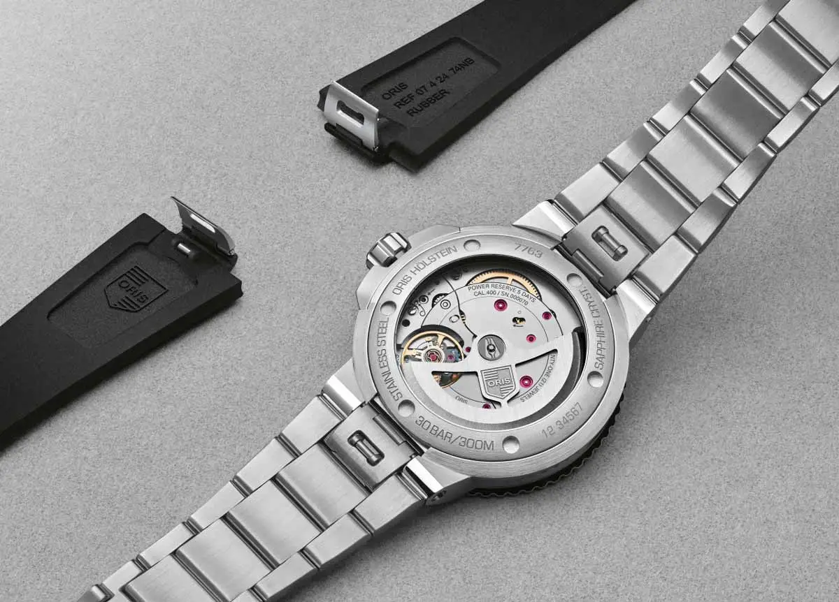 The Aquis models feature an integrated bracelet or rubber strap, distinctive indices and luminescent hands, as well as precision automatic movements, including the in-house calibre Oris 400 with a power reserve of up to 120 hours. The collection also offers complications such as GMT, date, small seconds or depth gauge.