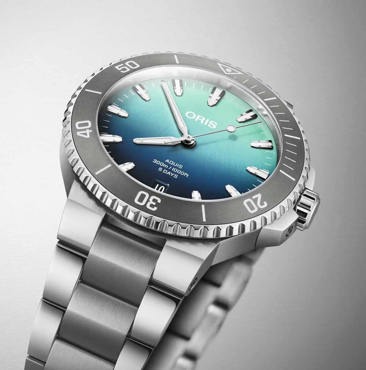 Oris Aquis is the brand's flagship diving collection that combines functionality, rugged construction and modern design. Designed for true underwater deployment, the Aquis collection offers water resistance up to 300 metres, a screw-down crown, unidirectional lunette and high resistance to shock and pressure.