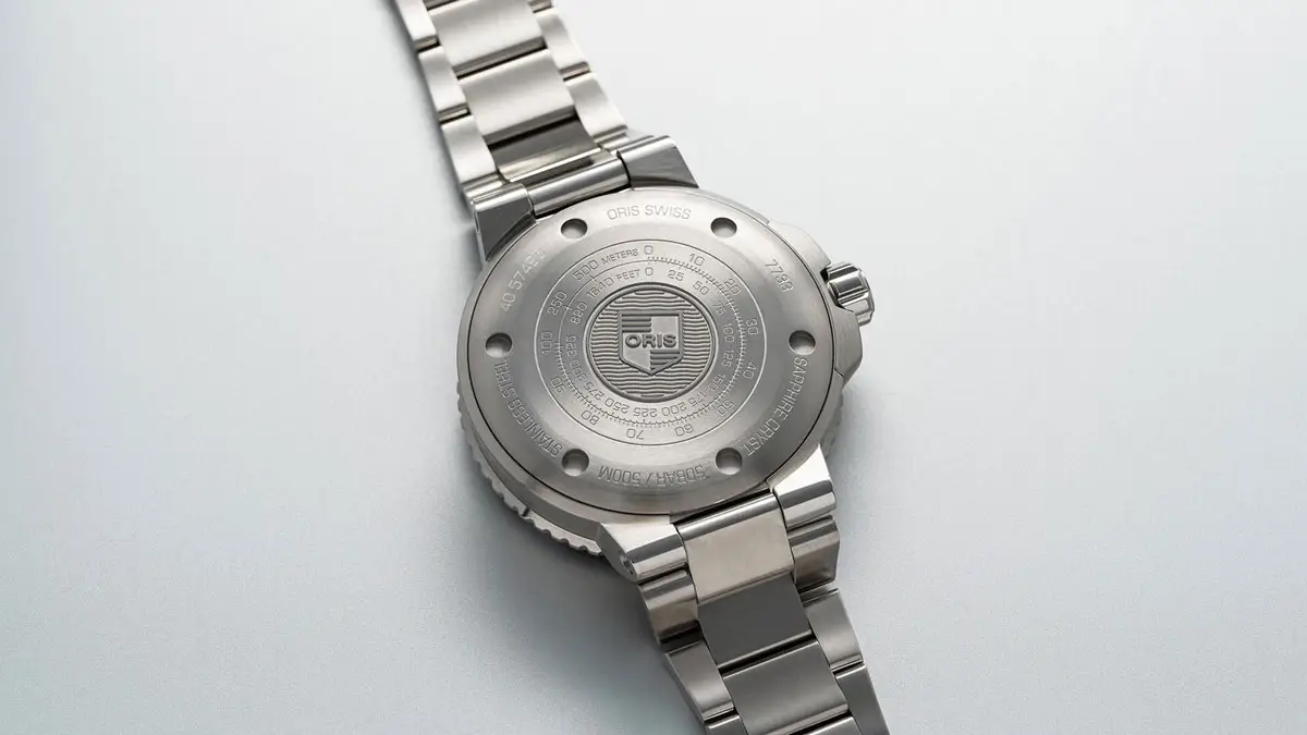 Inside beats the automatic Oris Calibre 743 (based on the Sellita SW 220-1), offering a 38-hour power reserve and reliable performance both for daily wear and deep-sea diving. The transparent case back reveals the beautifully finished movement, showcasing Oris’ dedication to mechanical craftsmanship.